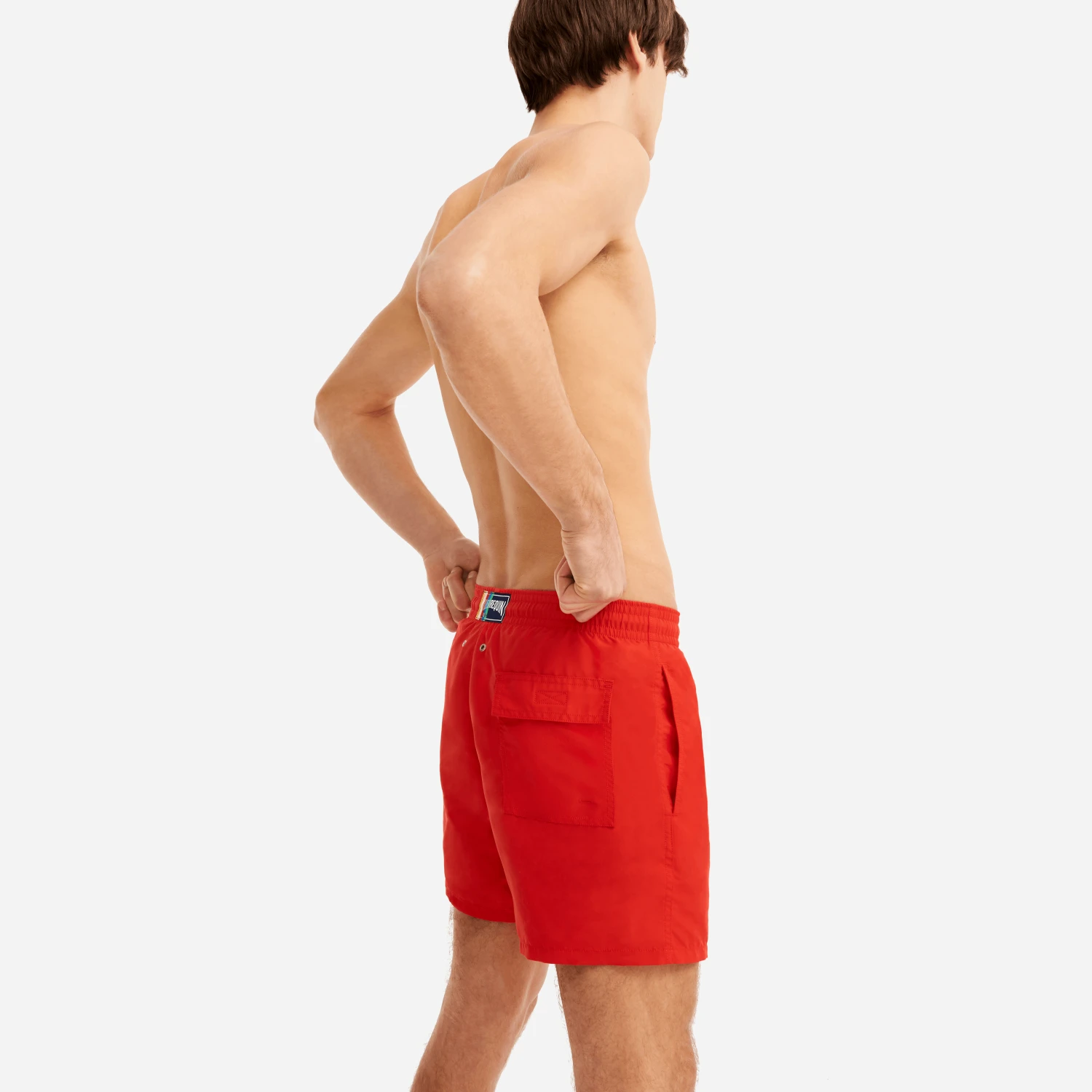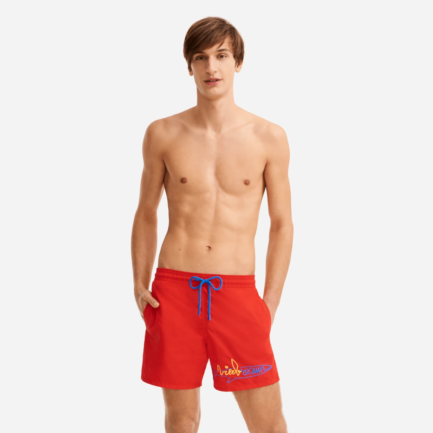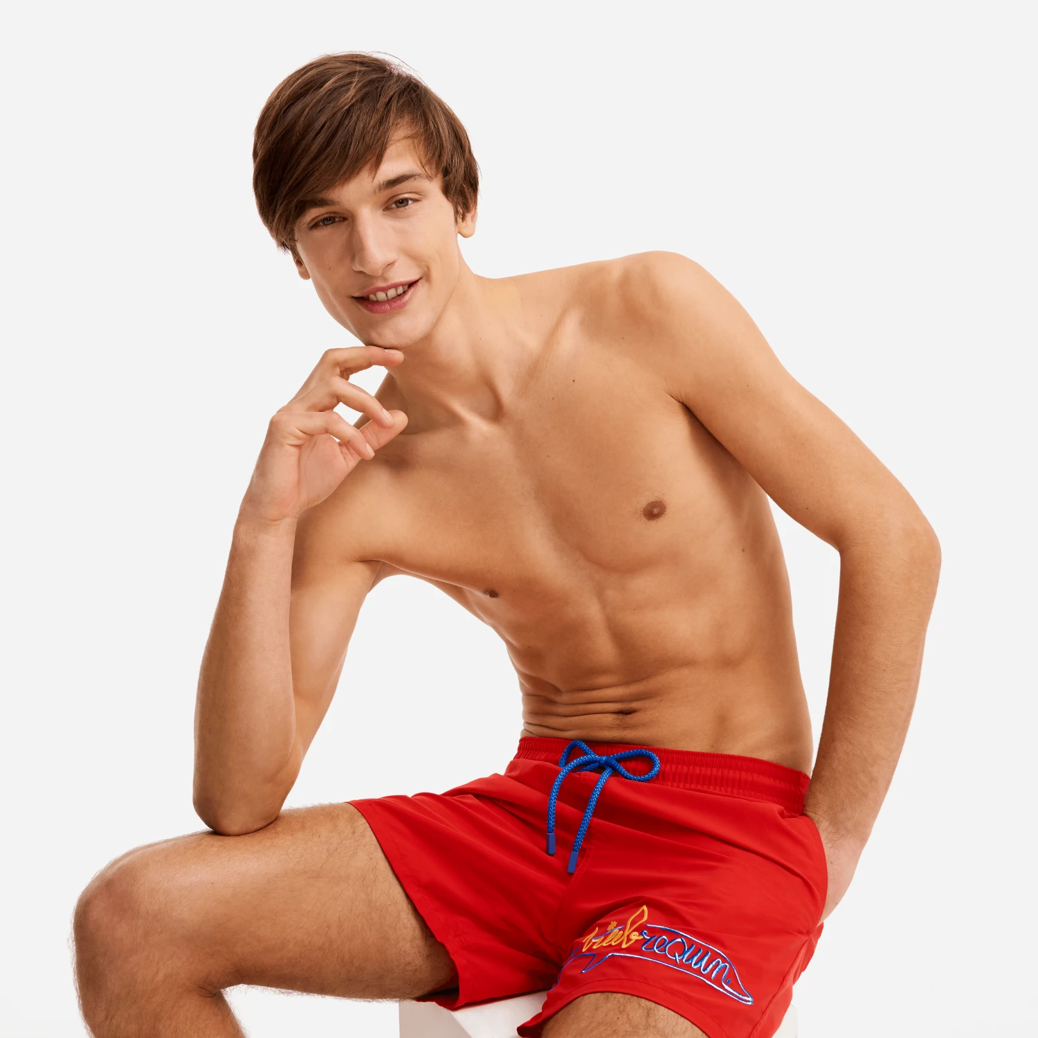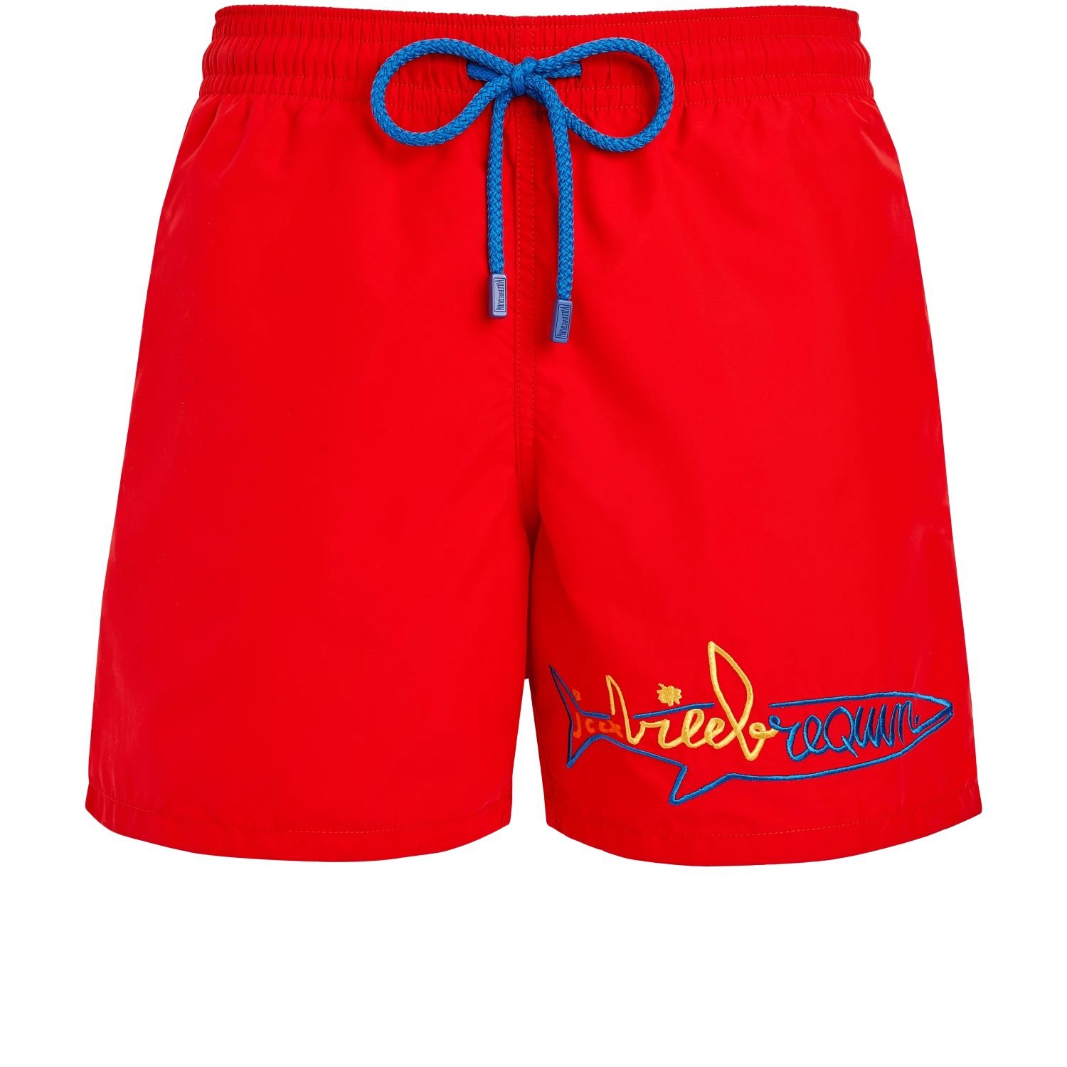 This deep red men Swim Trunks feature multicolor shark embroidery, place on the left leg. It has one scratch closing back pocket and two classic side pockets. The soft seamleass lining provides great comfort. The engraved zamac tips gives this model the Vilebrequin signature touch.