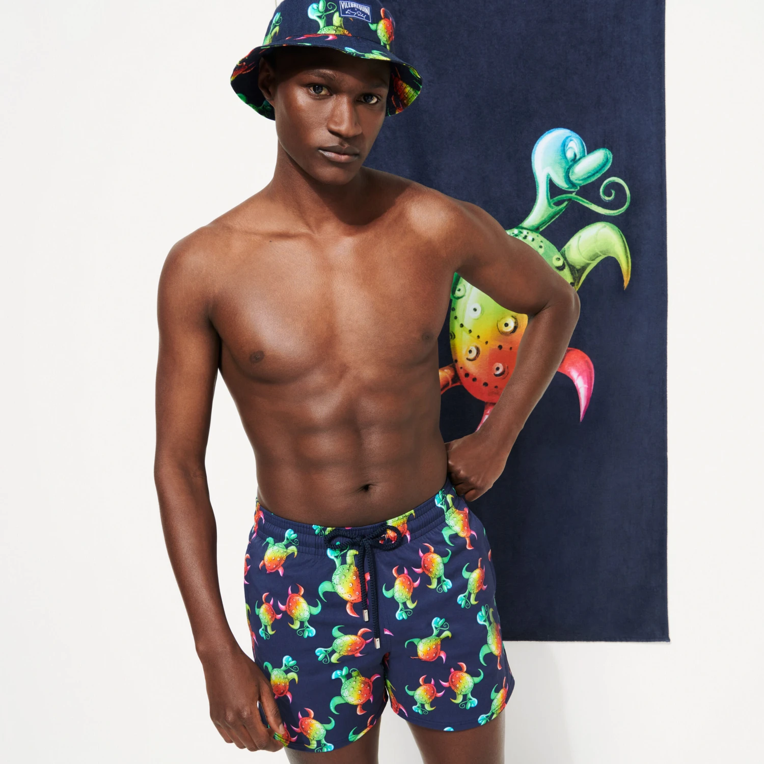 Curated by JRP|Editions for Vilebrequin, LA-born artist Kenny Scharf came up on the New York art scene in the 1980s. Steeped in imagery from 1950s American pop culture, his scenes and characters depict a cartoon-like utopia imbued with vibrant, optimistic colors. The Tortues Multicolor Rainbow print comes from Scharf’s Pop Surrealist universe overlapping with Vilebrequin’s signature joyful and playful DNA. Kenny Scharf’s designs are licensed by Artestar, New York.