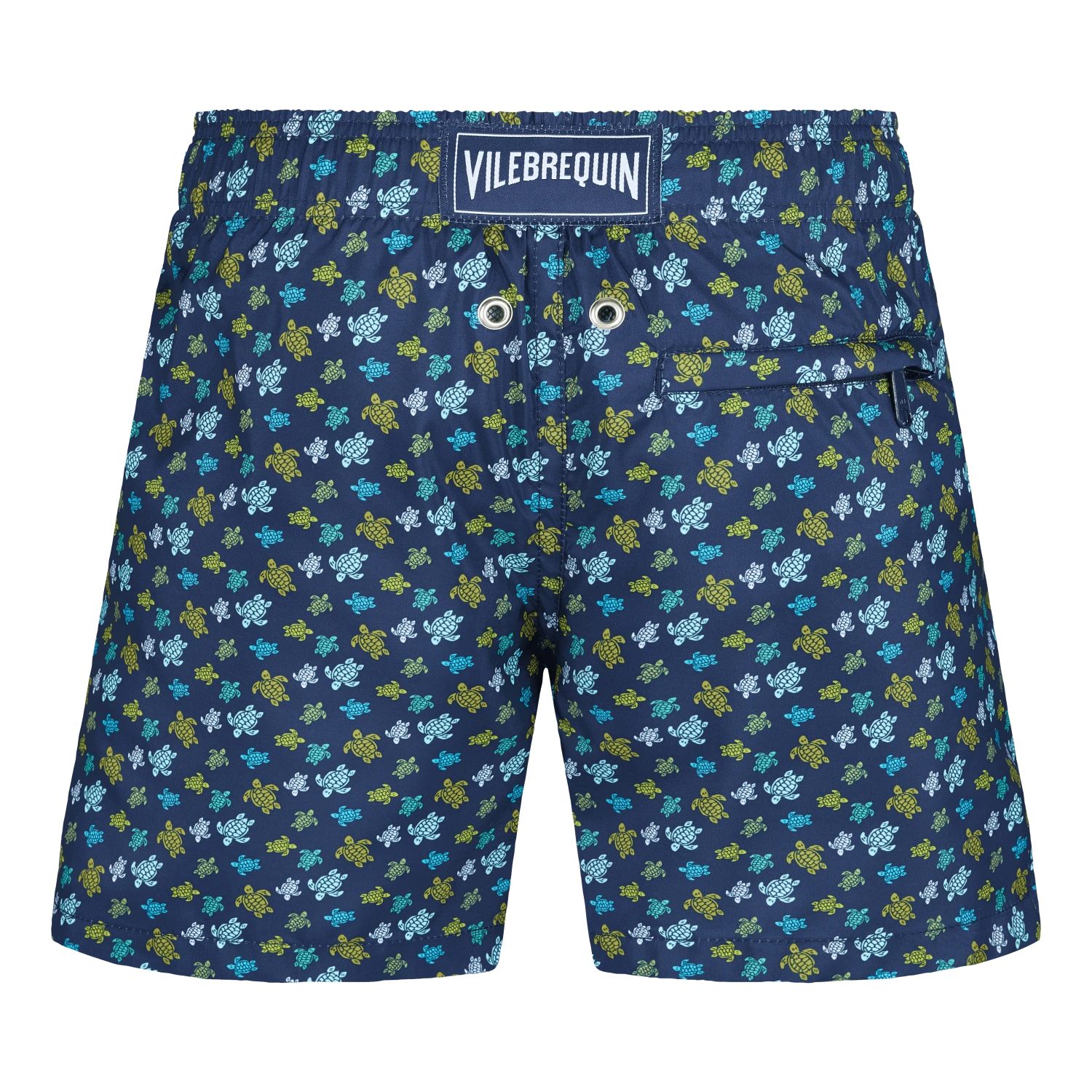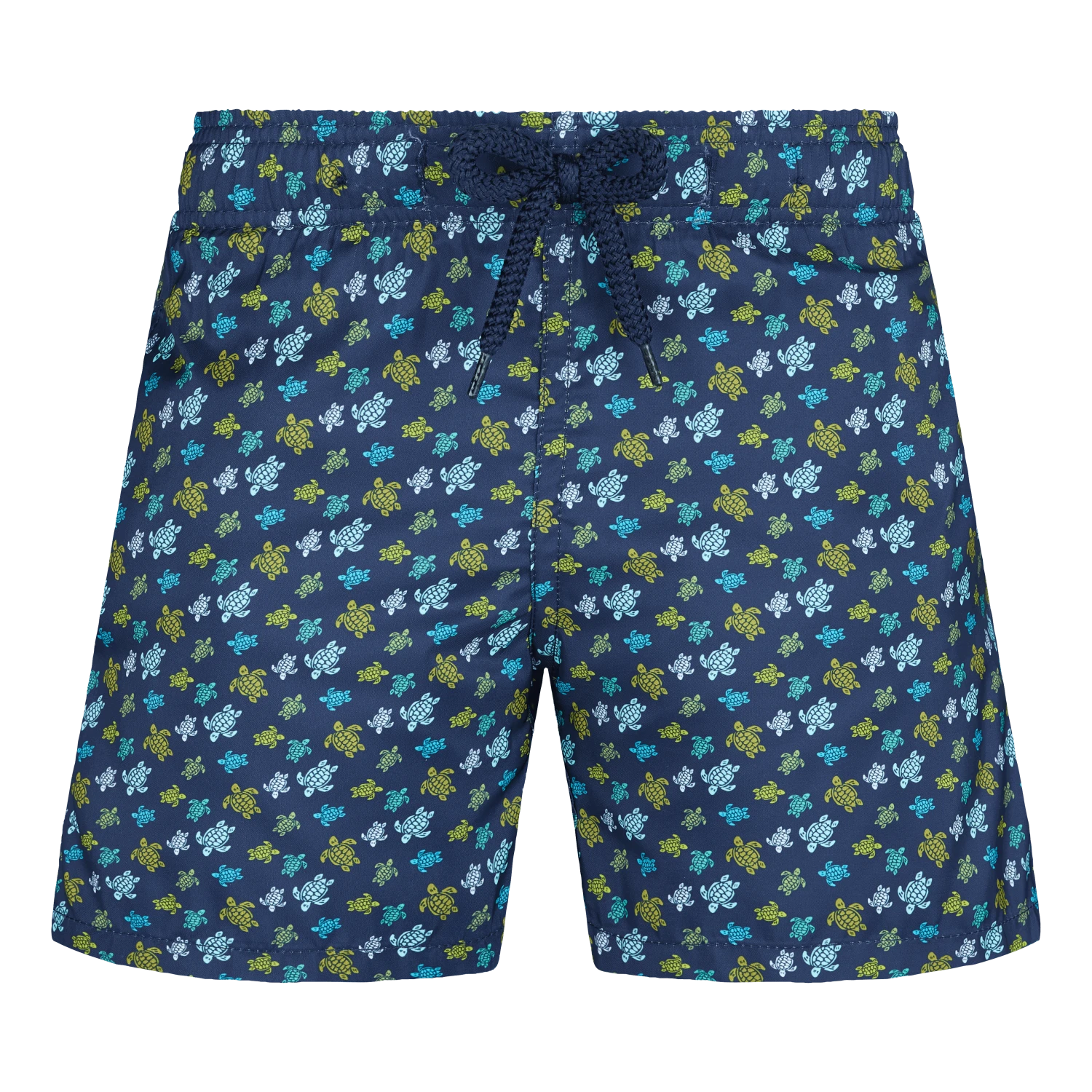 You’ve got it in the bag with these ultra-lightweight, foldaway Jihin boys’ swimming trunks. Decorated with a micro turtle print with a pointillist design, these shorts can be carried as a bag when stored away in the back pocket. They have a sewn-on bow in front.