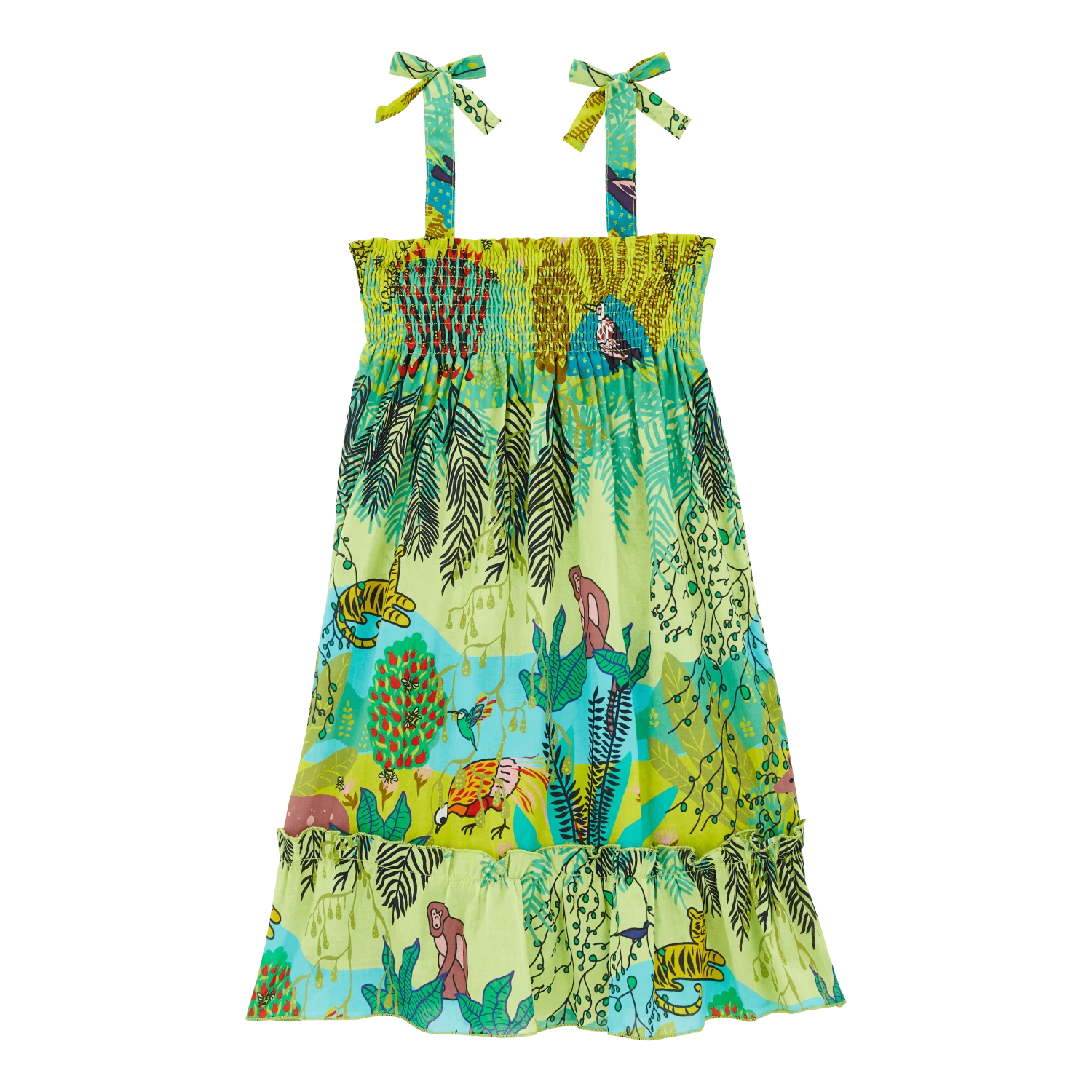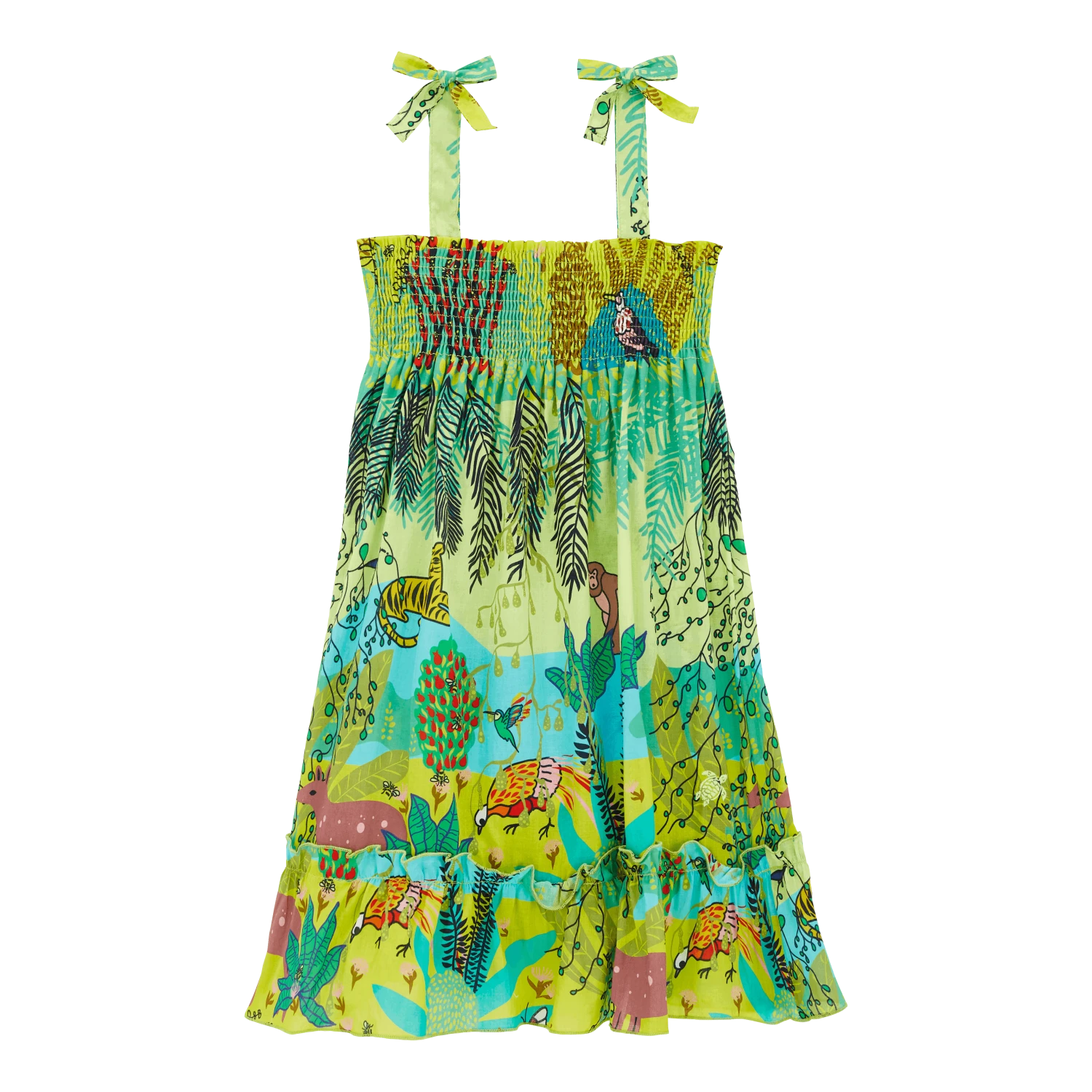 Birds, monkeys and butterflies flutter around on this Jungle Rousseau Gloss girls’ cotton dress. The exclusive print inspired by the famous painter gives this timeless strapless smocked dress a new look. Girls love the big ruffle and the shoulder bows.