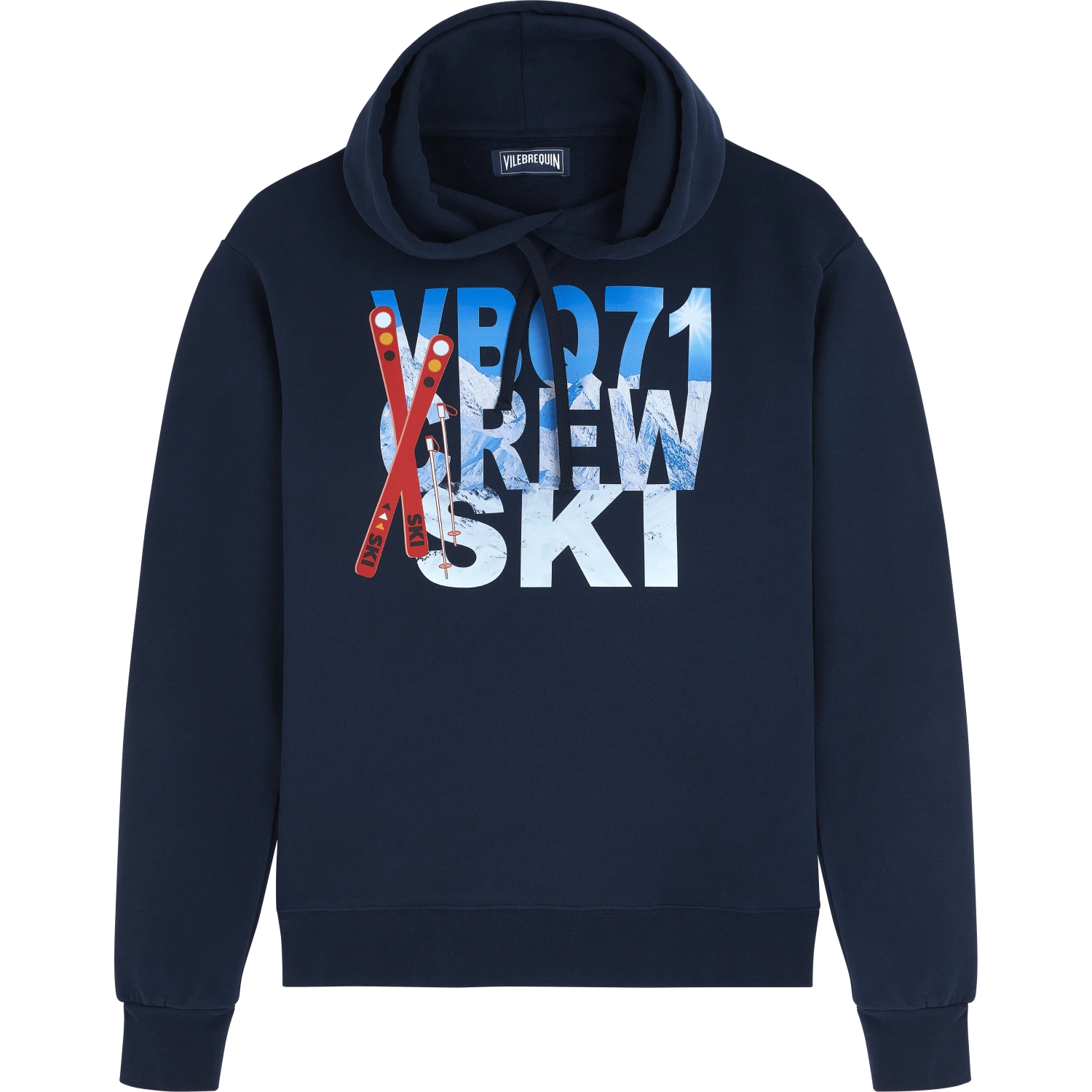 The Vilebrequin tribe is ready to welcome you with open arms. Join the VBQ71 Crew with the winter print of the Chablais men’s cotton hoodie. Skis and mountain peaks feature on this fashion-forward long-sleeved top with its sporty style. The hood has a drawstring.