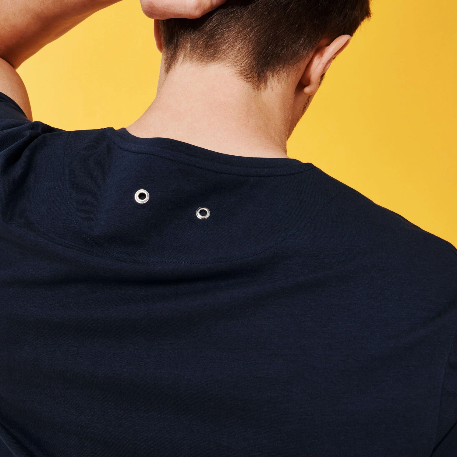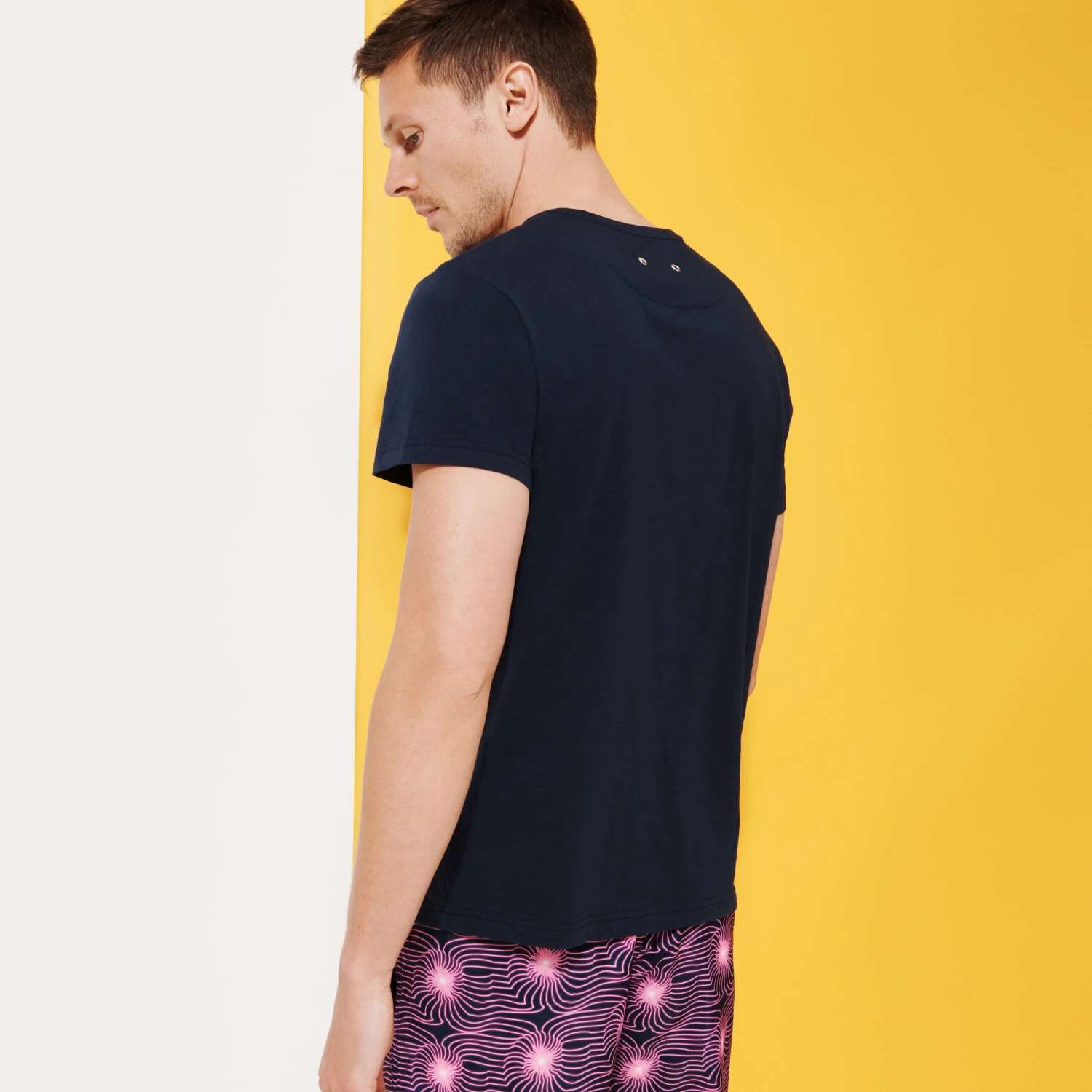 Proudly show off this season’s motif with the Thom Hypno Shell men’s cotton T-shirt. Zingy electric seashells are hidden on the Vilebrequin logo on this short-sleeved, round-neck top. It has two eyelets at the back.