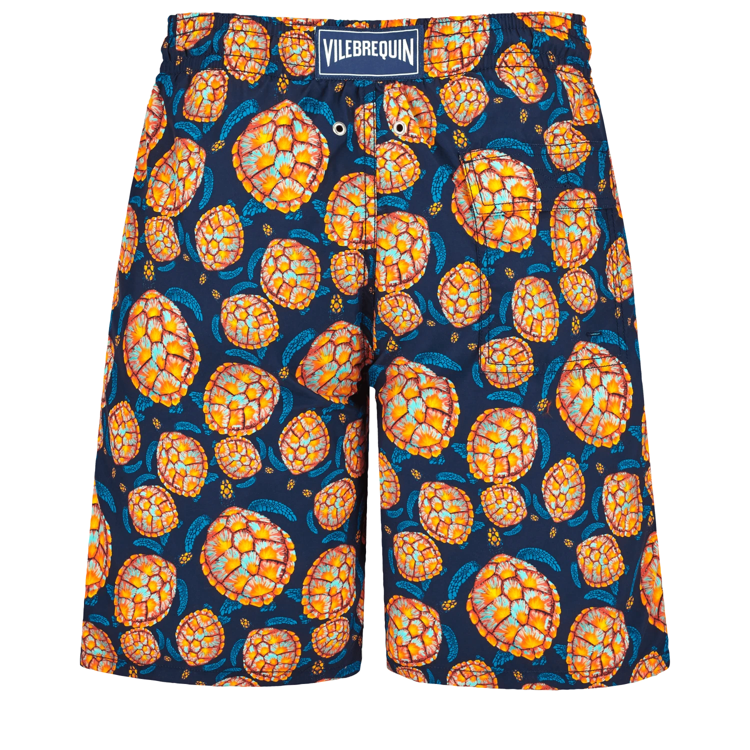 Turtles take pride of place, their iridescent scales shining brightly on your Okoa Carapaces long swimming trunks.