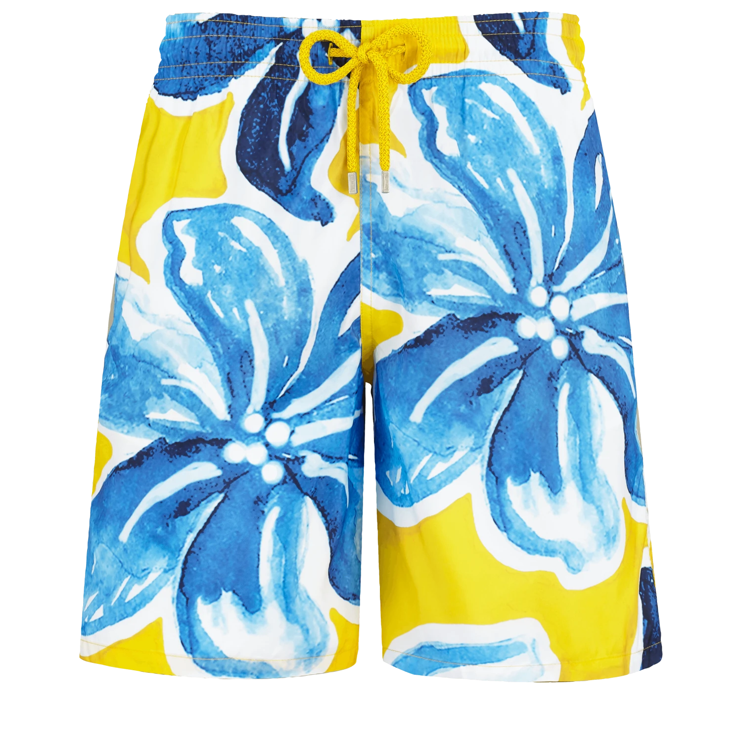 Tiaré flower turn up the volume to give you a glimpse of a Polynesian paradise. Their petals are blossoming boldly on these Okohina Macro Raiatea long swimming trunks.