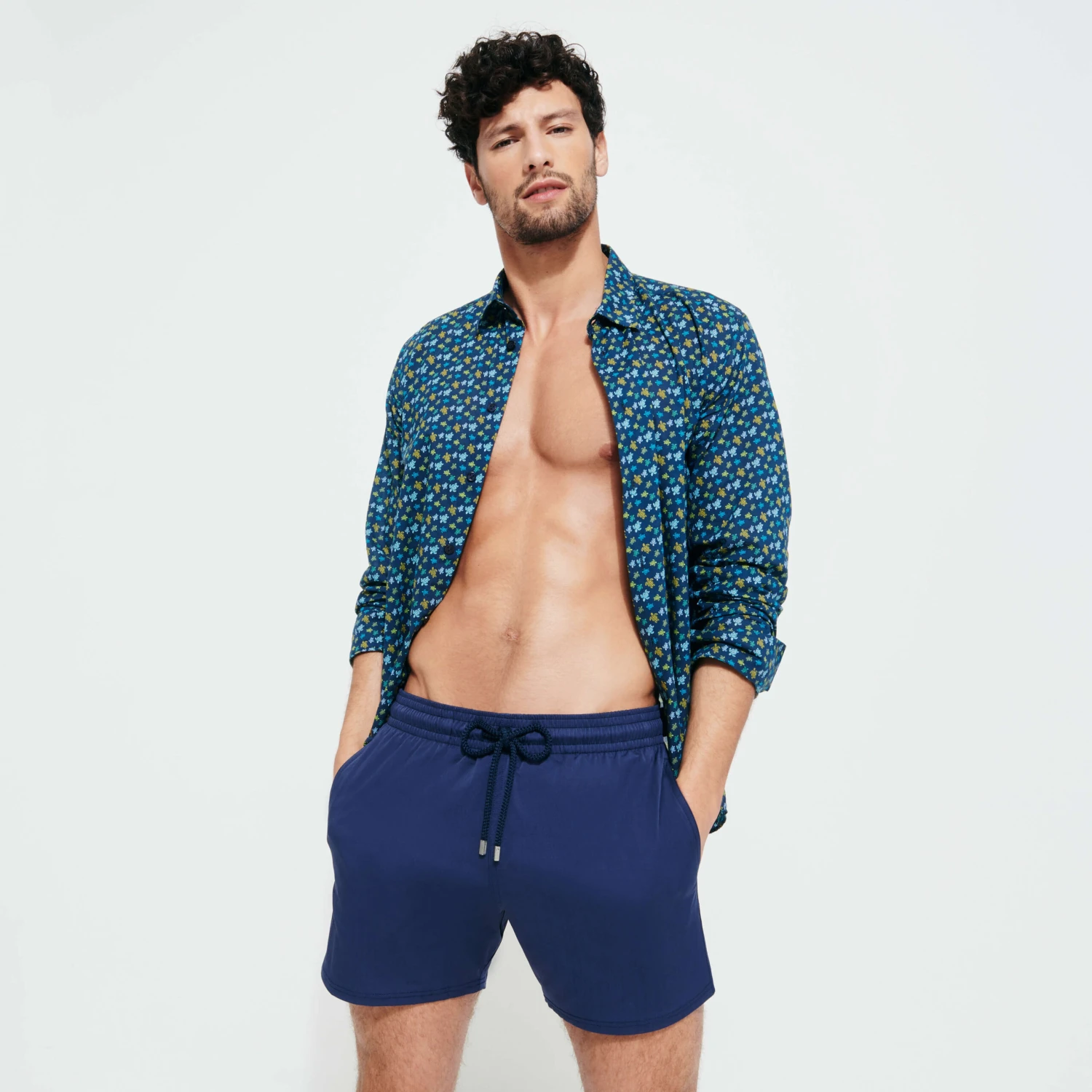 - Size M: Leg length: 14.5″/ Inseam 4.25″. A shorter version of the classic Moorea men’s swim trunks