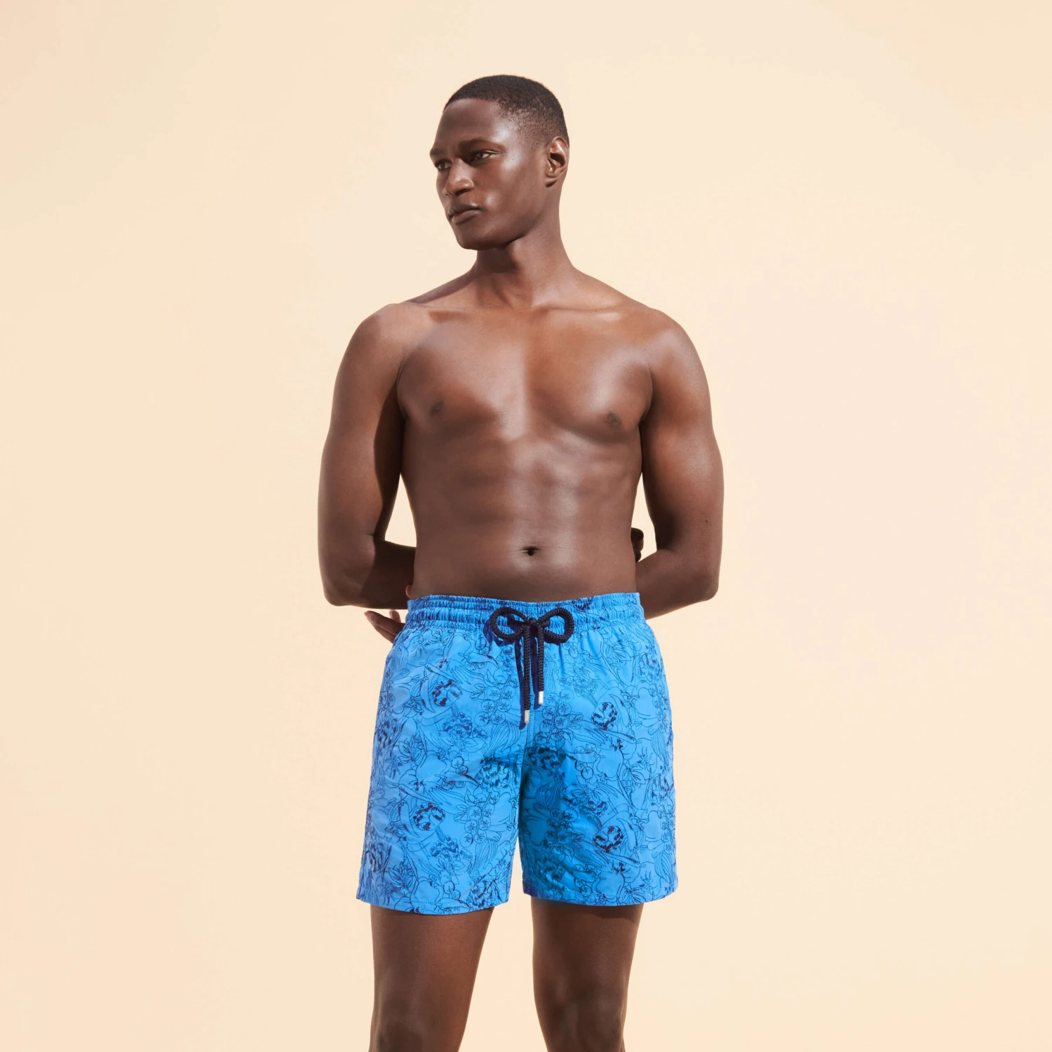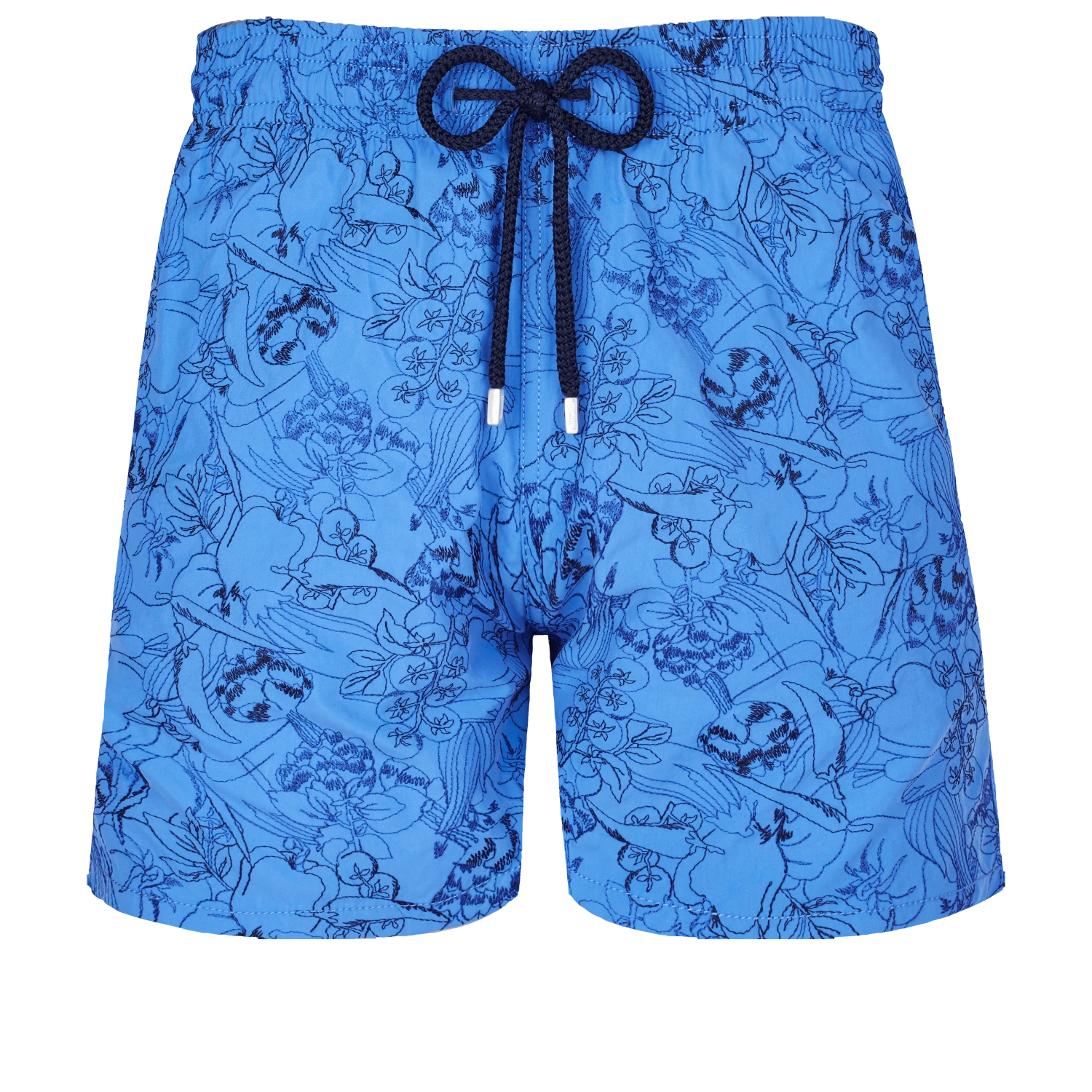 All hail the Mediterranean way of life. Tomatoes, peppers and other sunny vegetables are intermingled on the embroidered Mistral swimming trunks, transporting you to a Provençal food market.