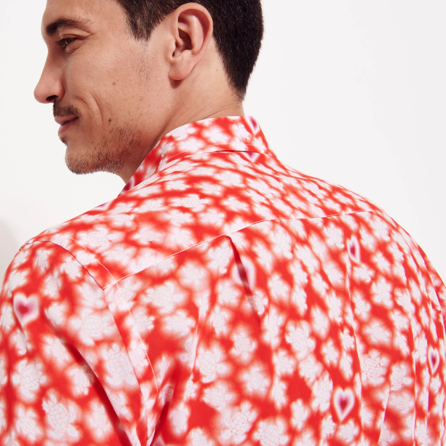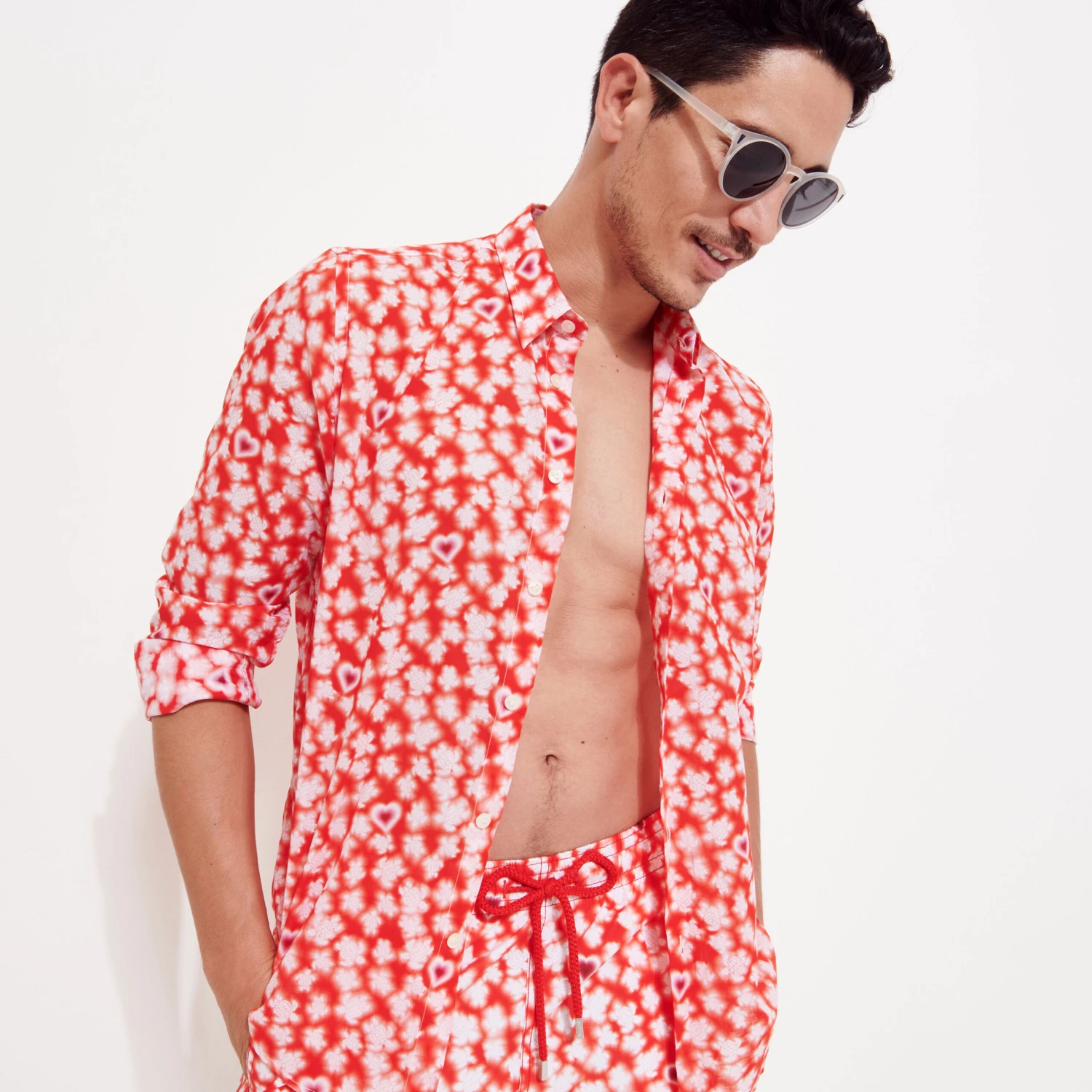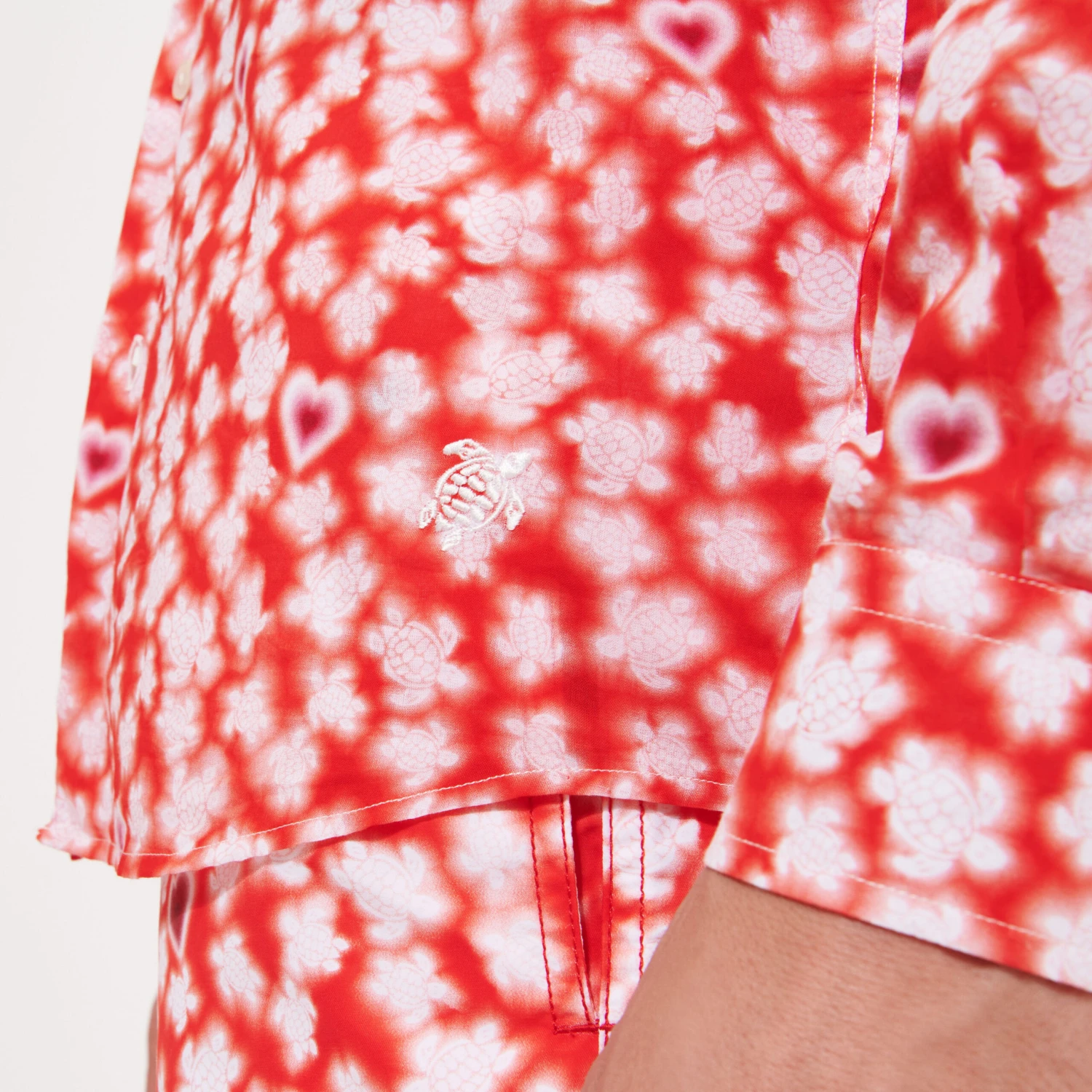 Turtles turn into Cupids on this Caracal Catchers lightweight unisex cotton voile shirt. Its playful patterns and piquant hue will goes with any look, whether it’s for the beach or the evening. An embroidered Vilebrequin turtle is hidden among the hearts.