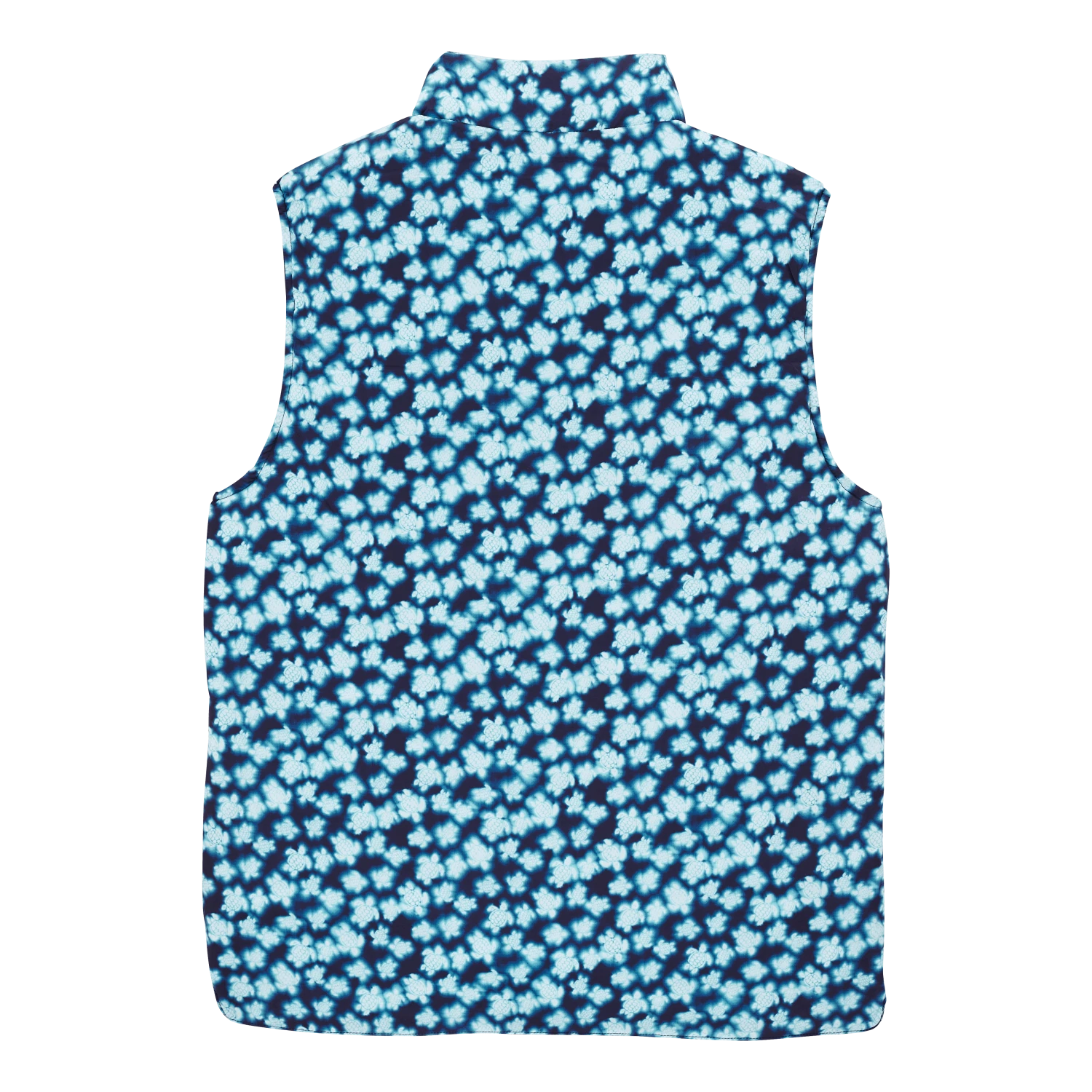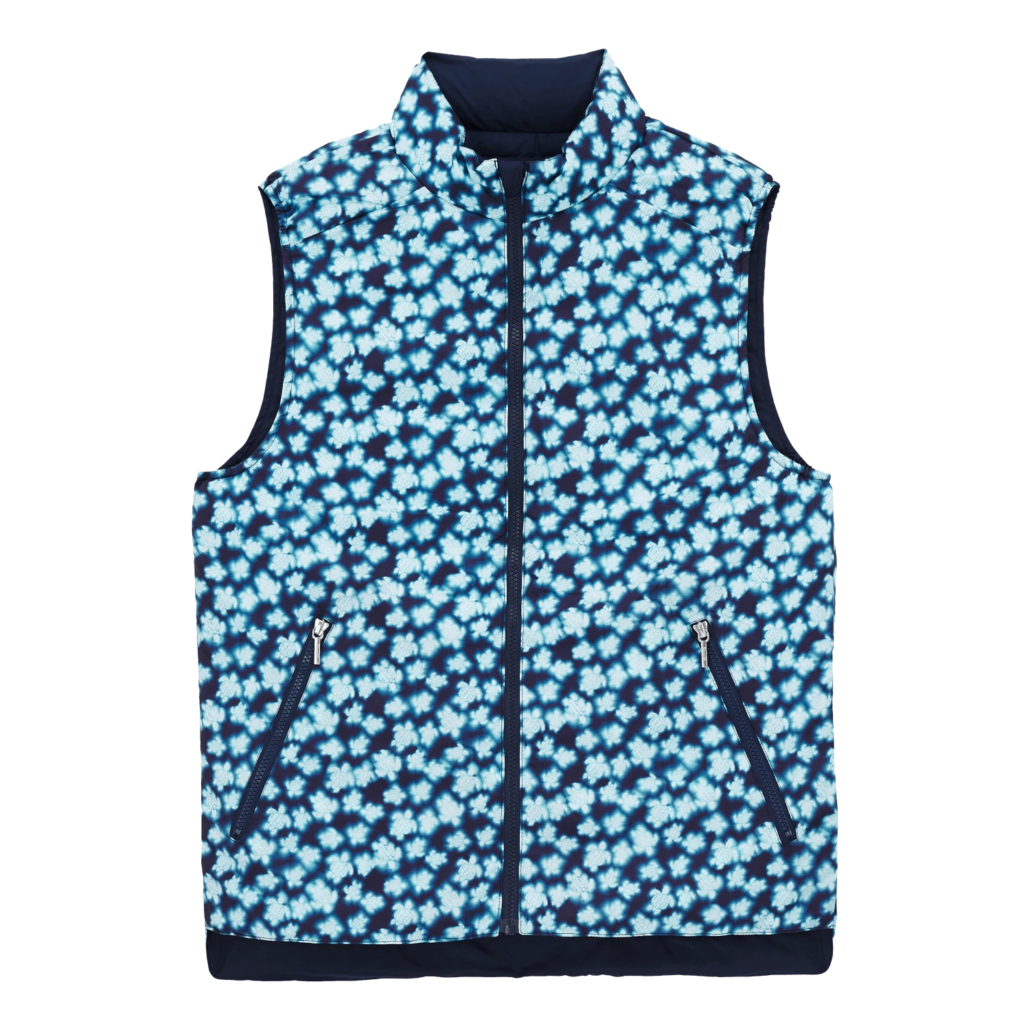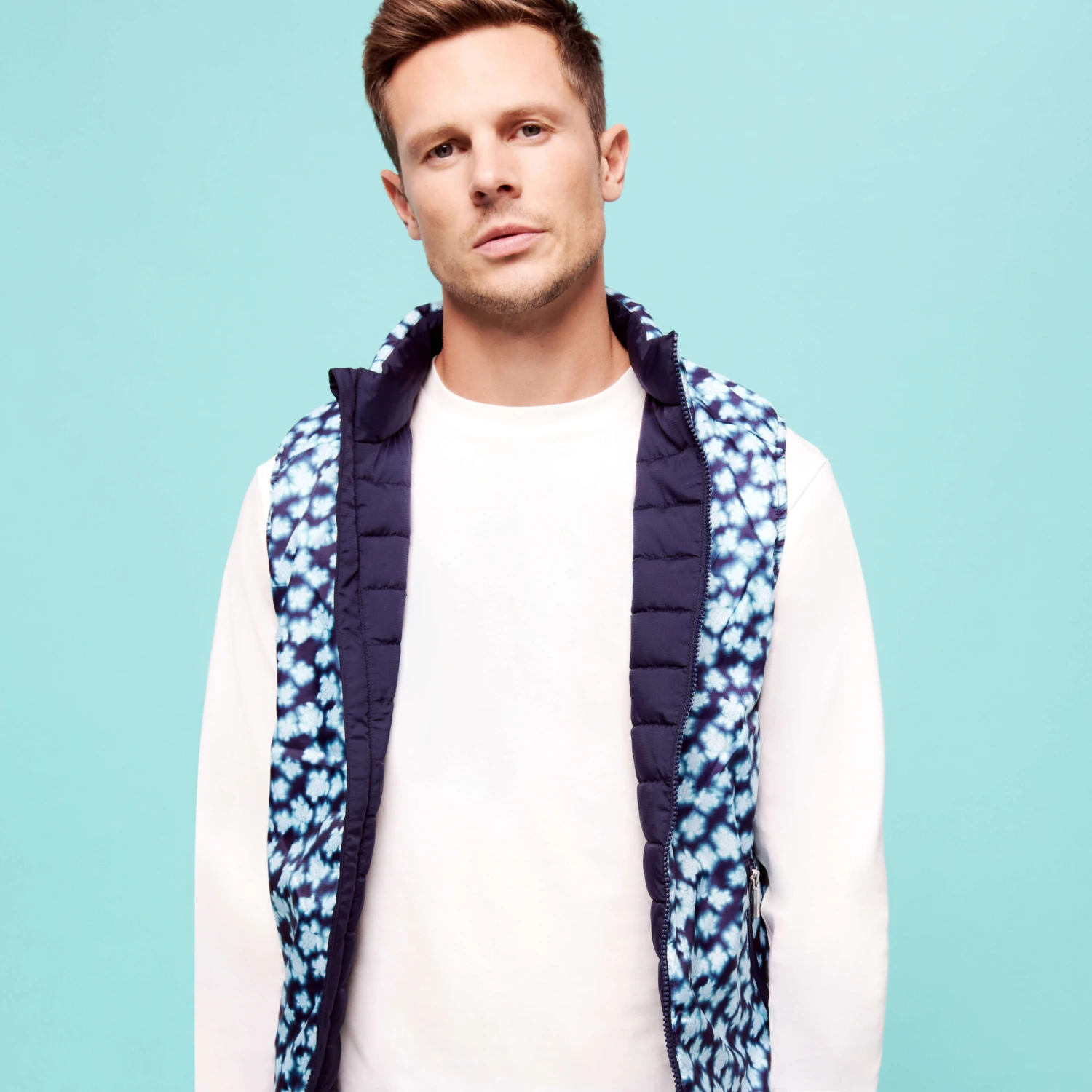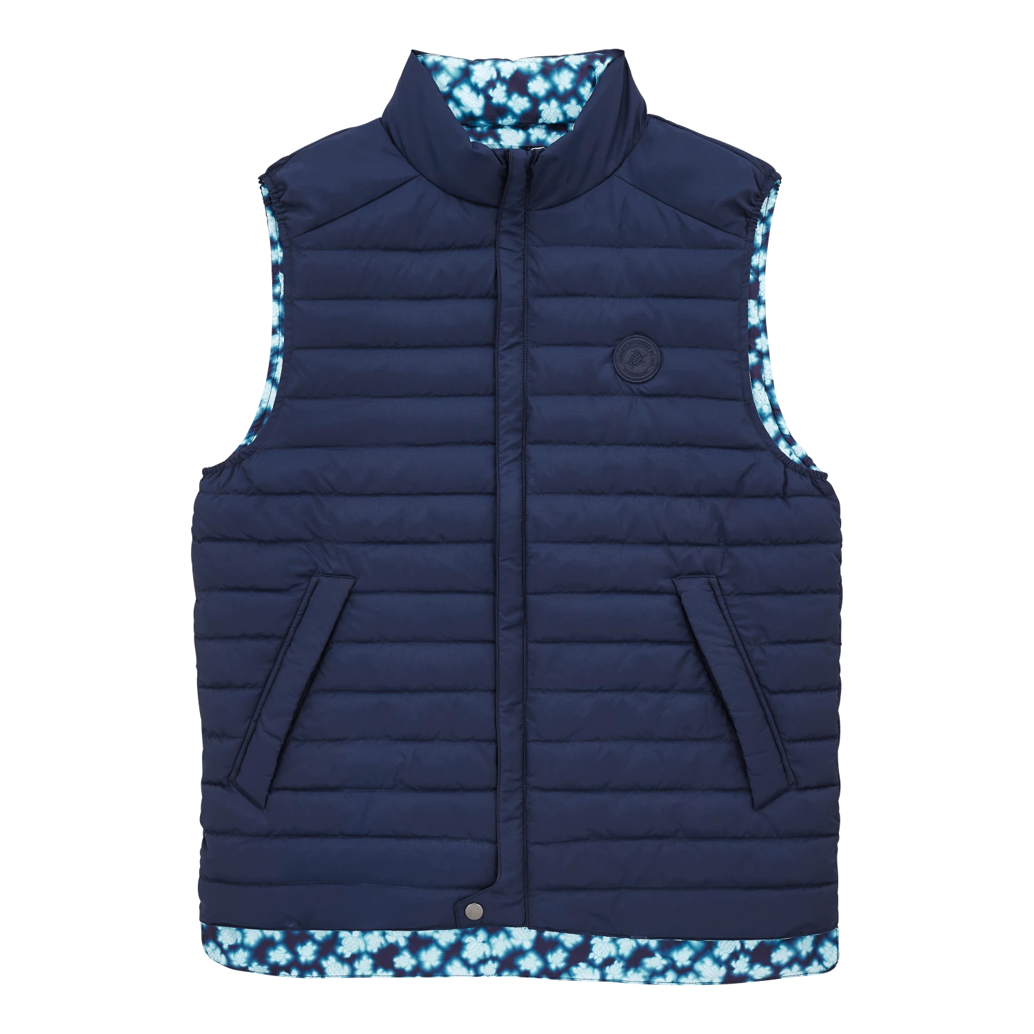 An unisex, sleeveless jacket that’s padded for warmth. The outer layer is plain, and the inner lining features the exclusive “Blurred Turtles” print by Vilebrequin. In France, this garment is called a “doudoune”, and it’s a useful and trendy item for those cooler days when the sea breezes blow. The vest is reversible and made of recycled polyester.