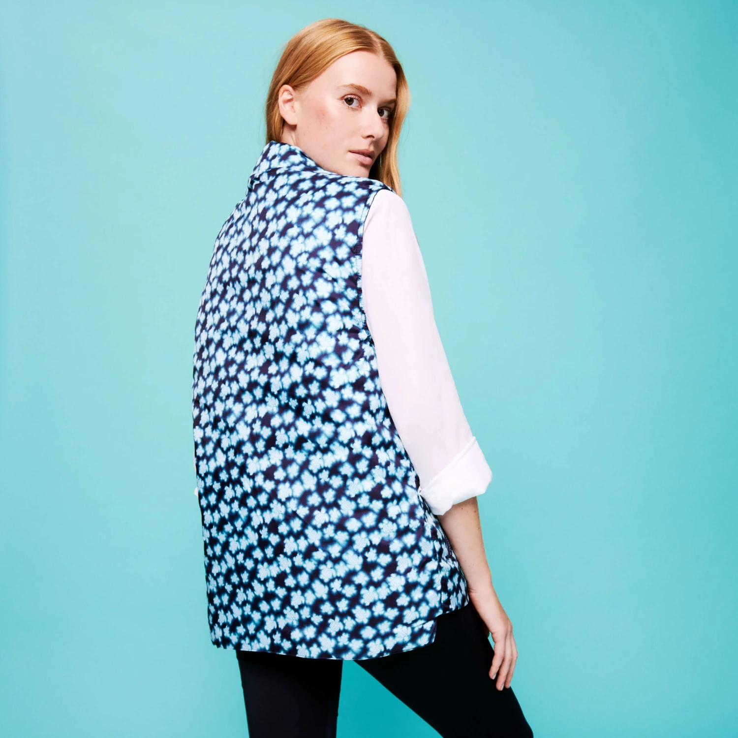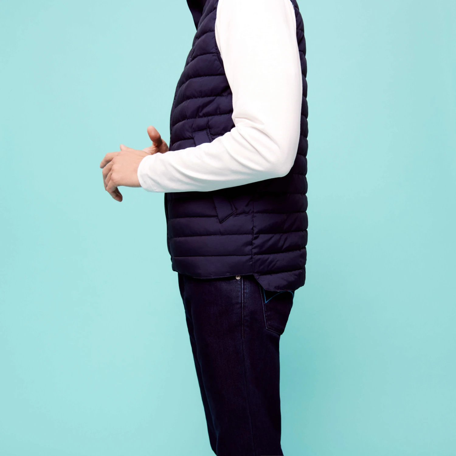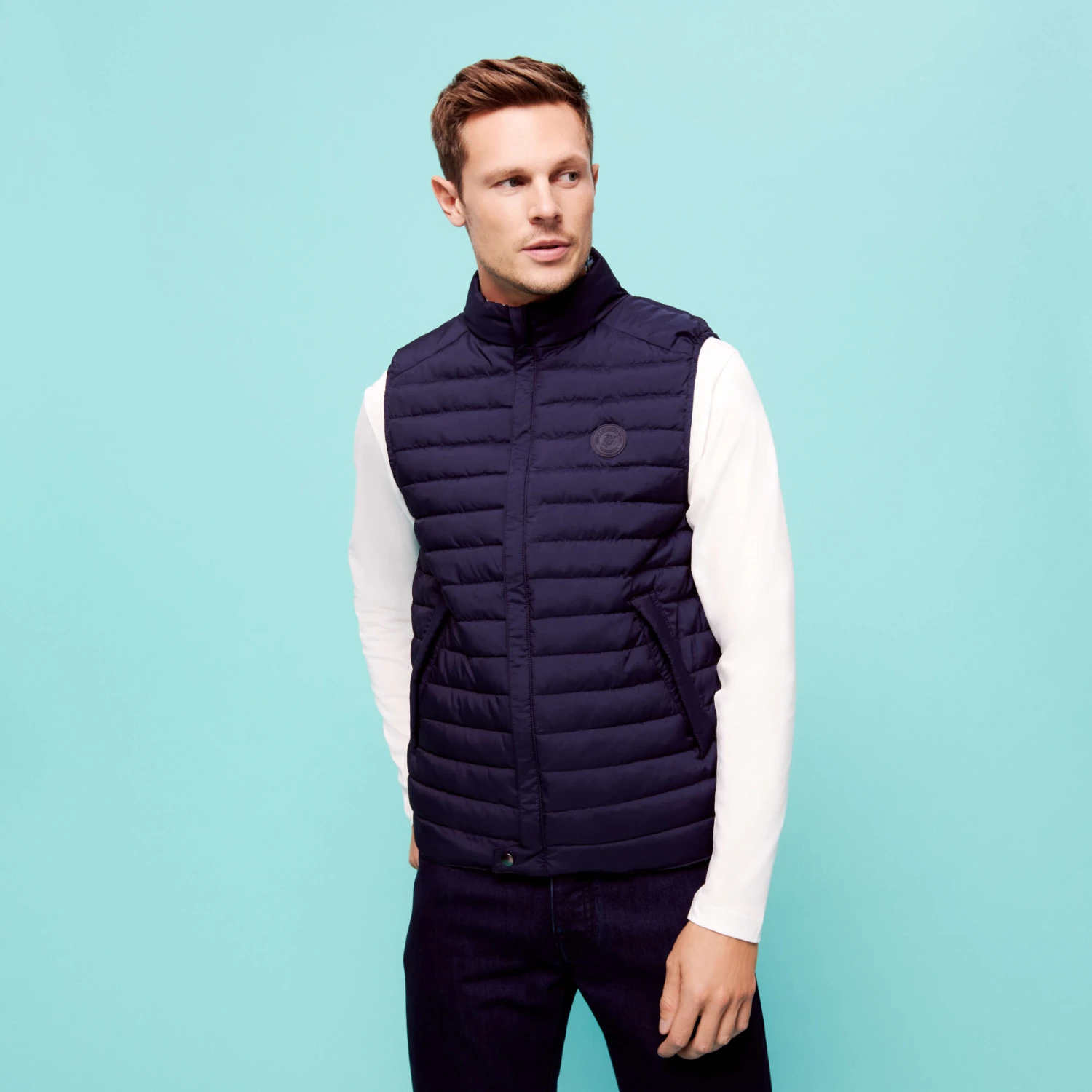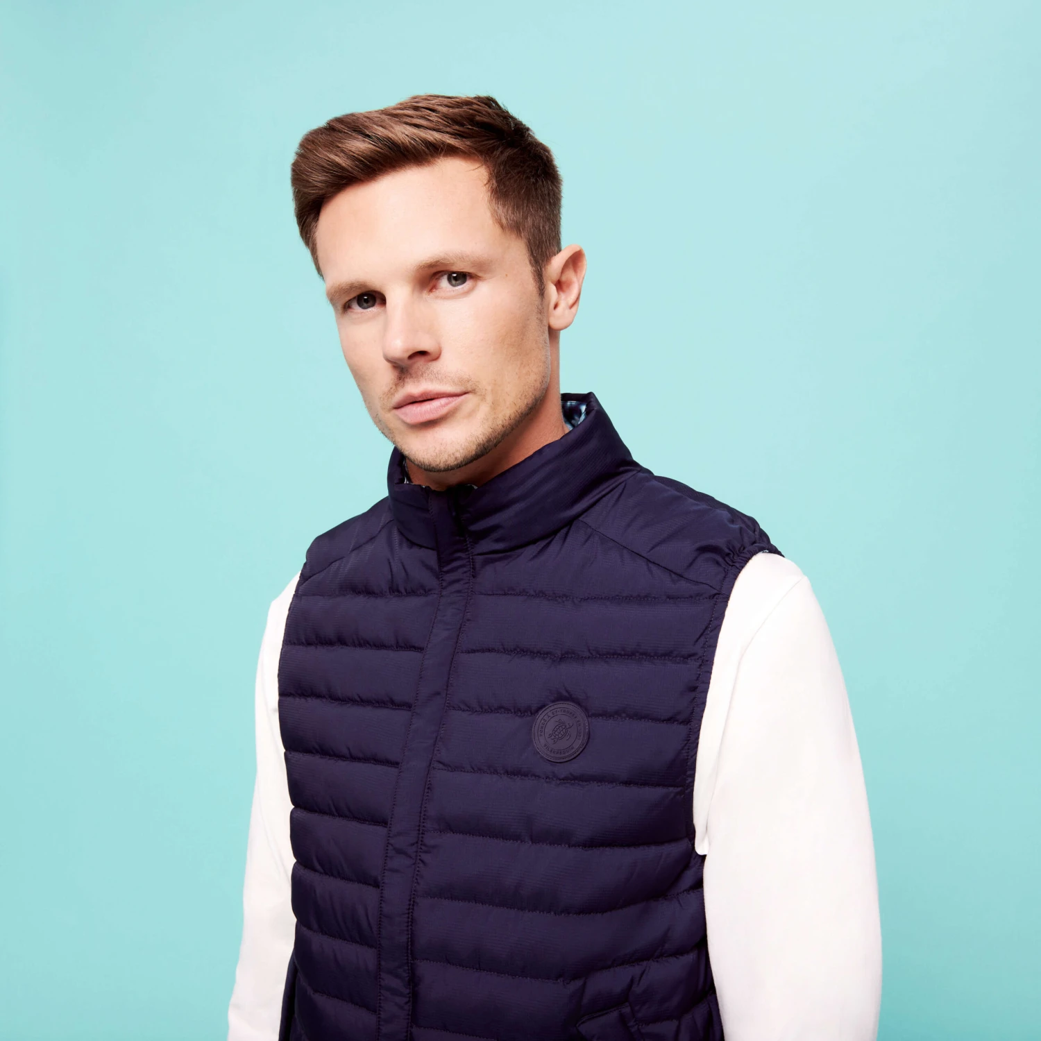 An unisex, sleeveless jacket that’s padded for warmth. The outer layer is plain, and the inner lining features the exclusive “Blurred Turtles” print by Vilebrequin. In France, this garment is called a “doudoune”, and it’s a useful and trendy item for those cooler days when the sea breezes blow. The vest is reversible and made of recycled polyester.