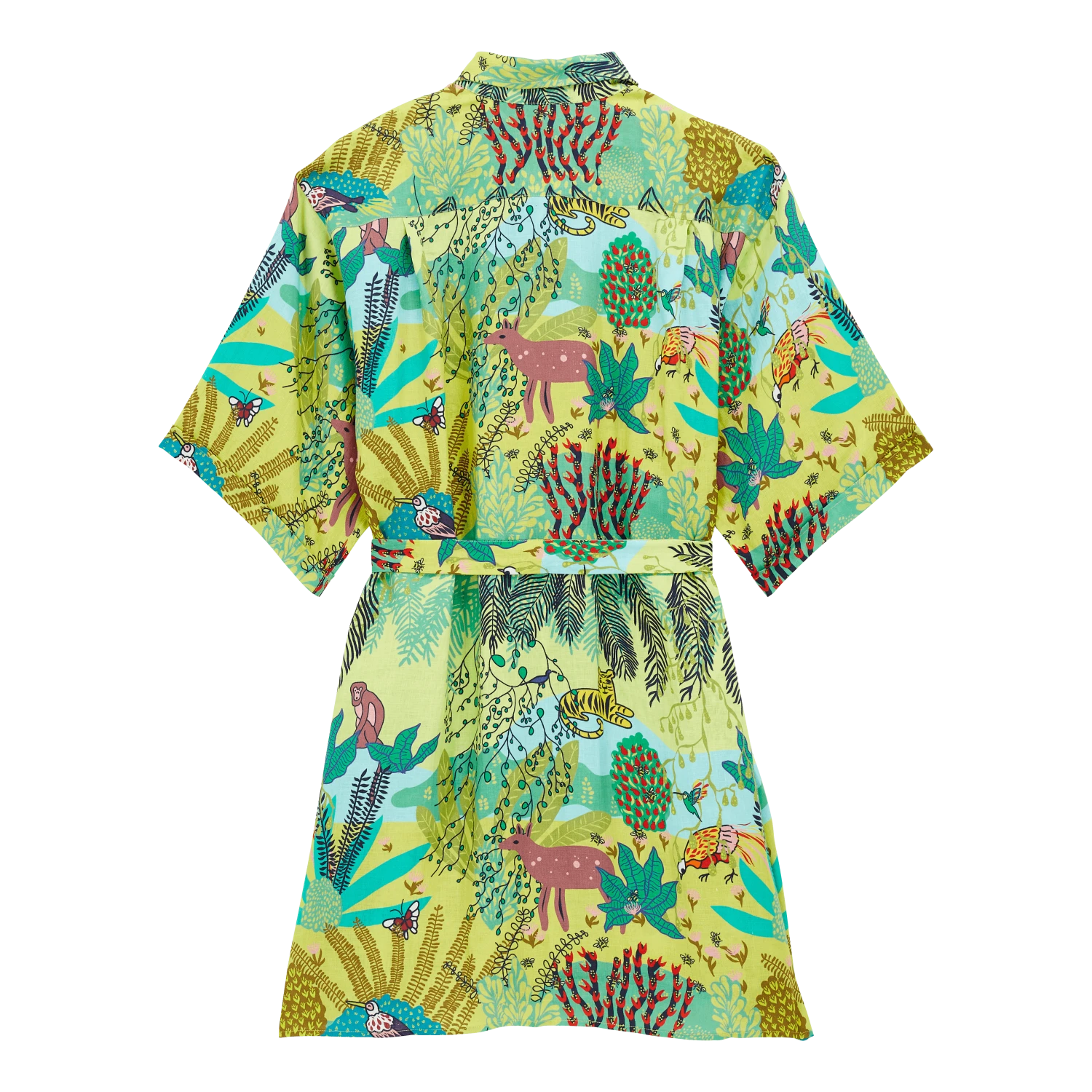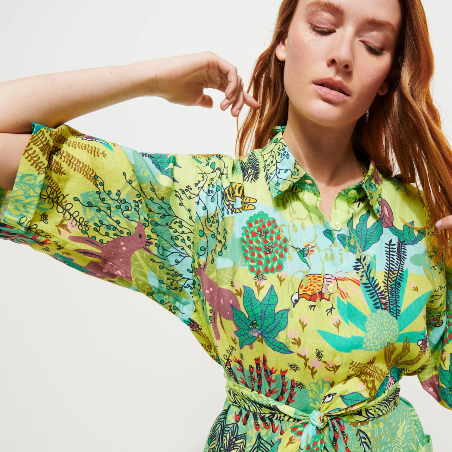 Set off on an adventure with the exotic patterns of the Faro Jungle Rousseau women’s linen shirt dress. Its short roll-up sleeves and patch pockets evoke a safari jacket. Structured but casual, it can be worn day or night.