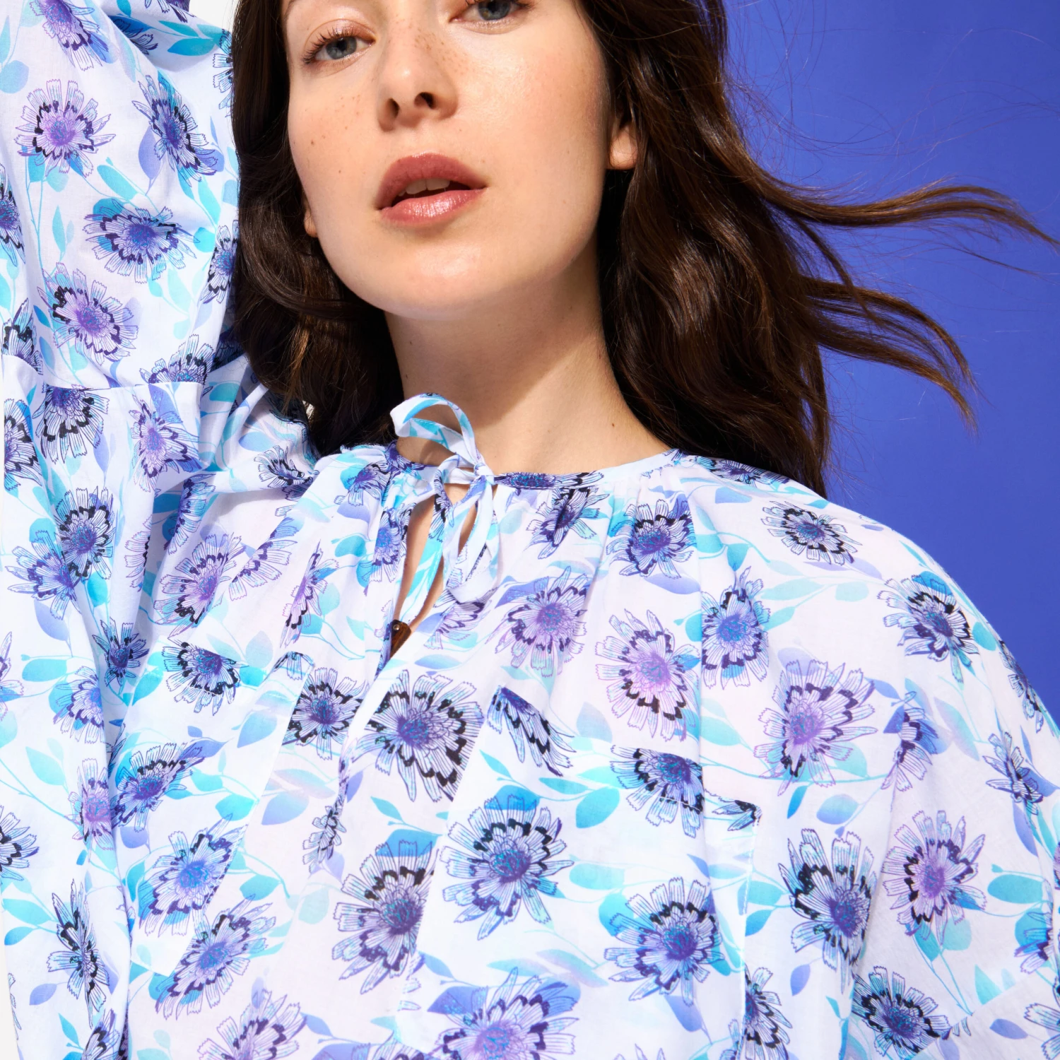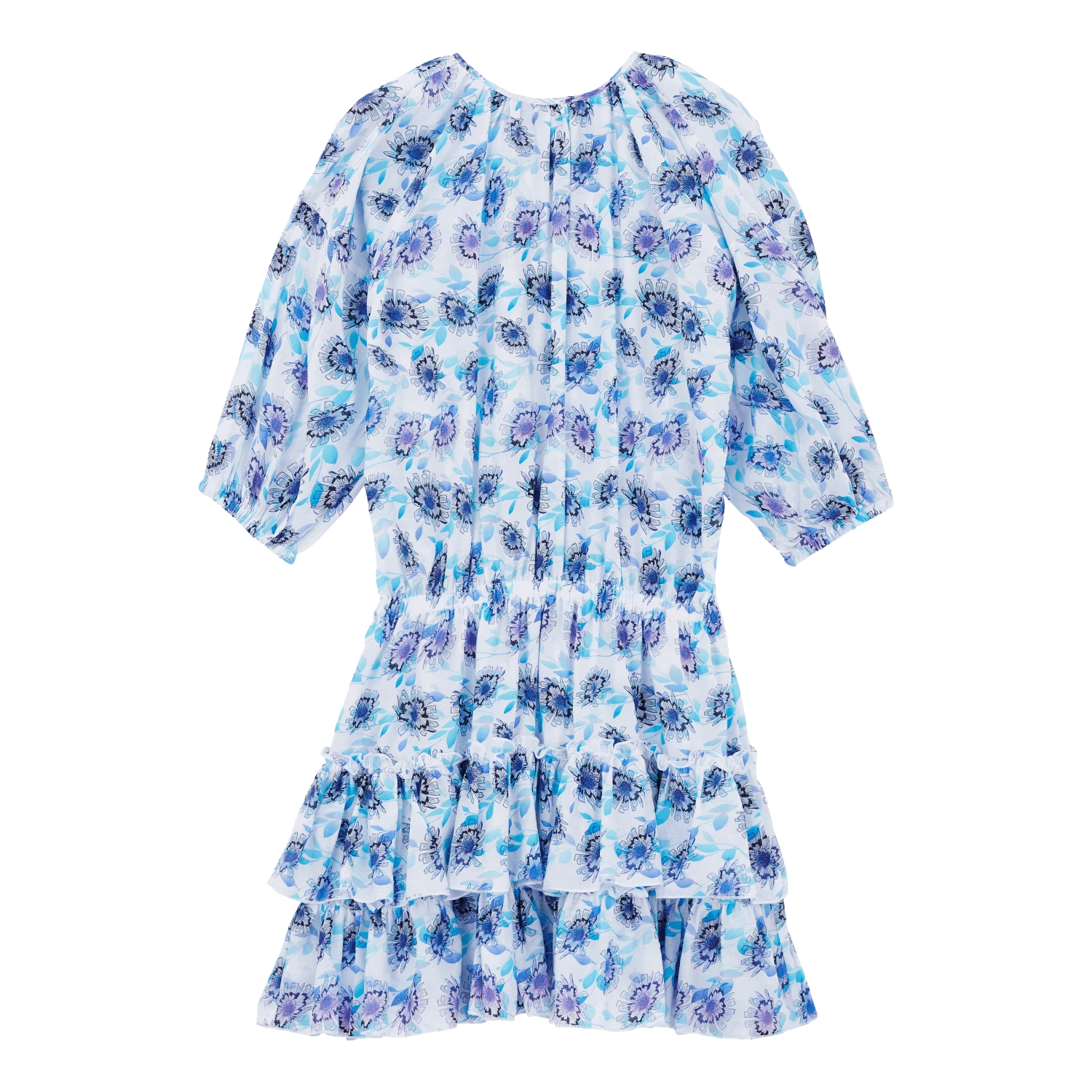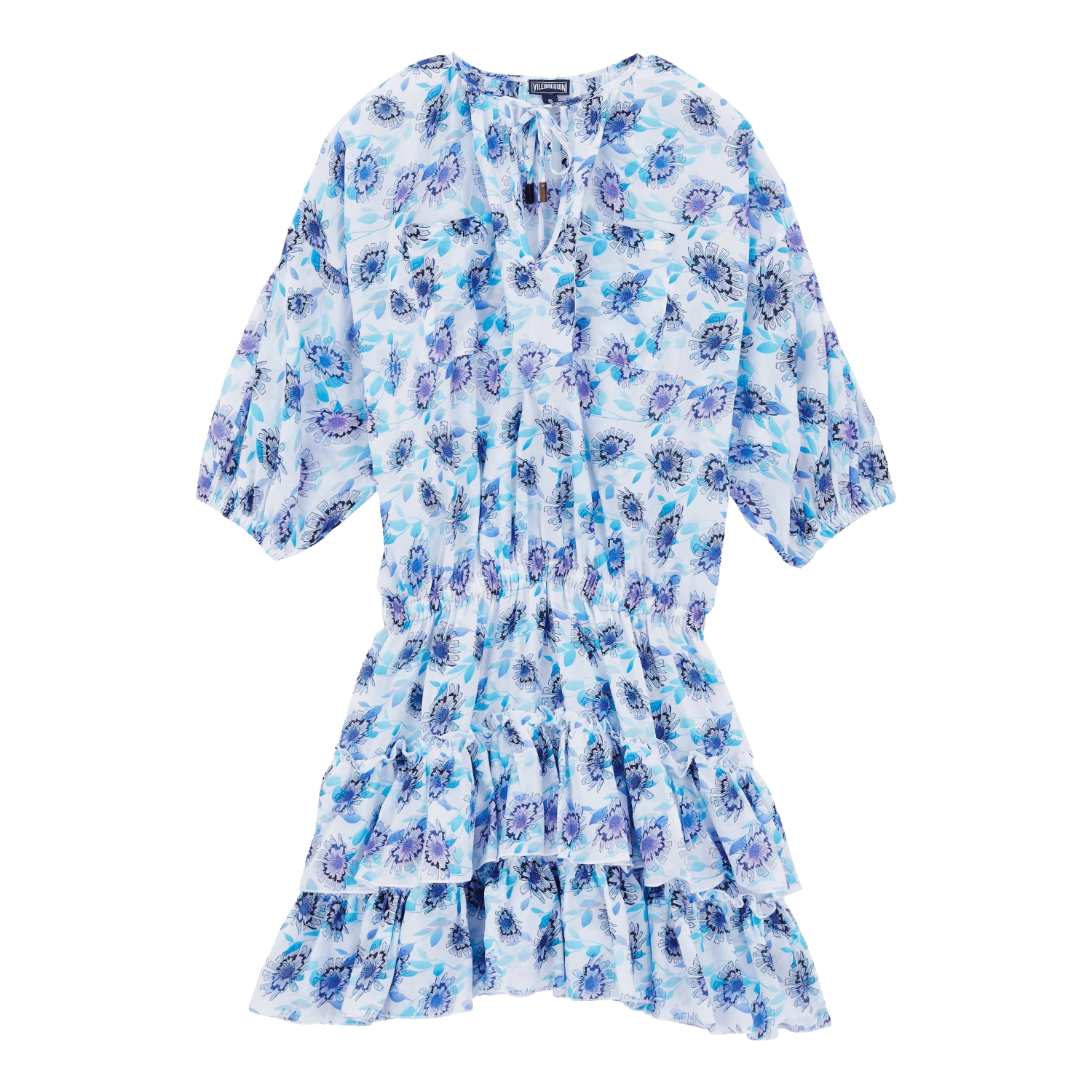 Go floral all season long with the Flash Flowers pattern on the Lauriane women’s short cotton ruffled dress. With its floaty Boho chic design, it features a split neckline that fastens with ties featuring tips. The waist and cuffs are elasticated.