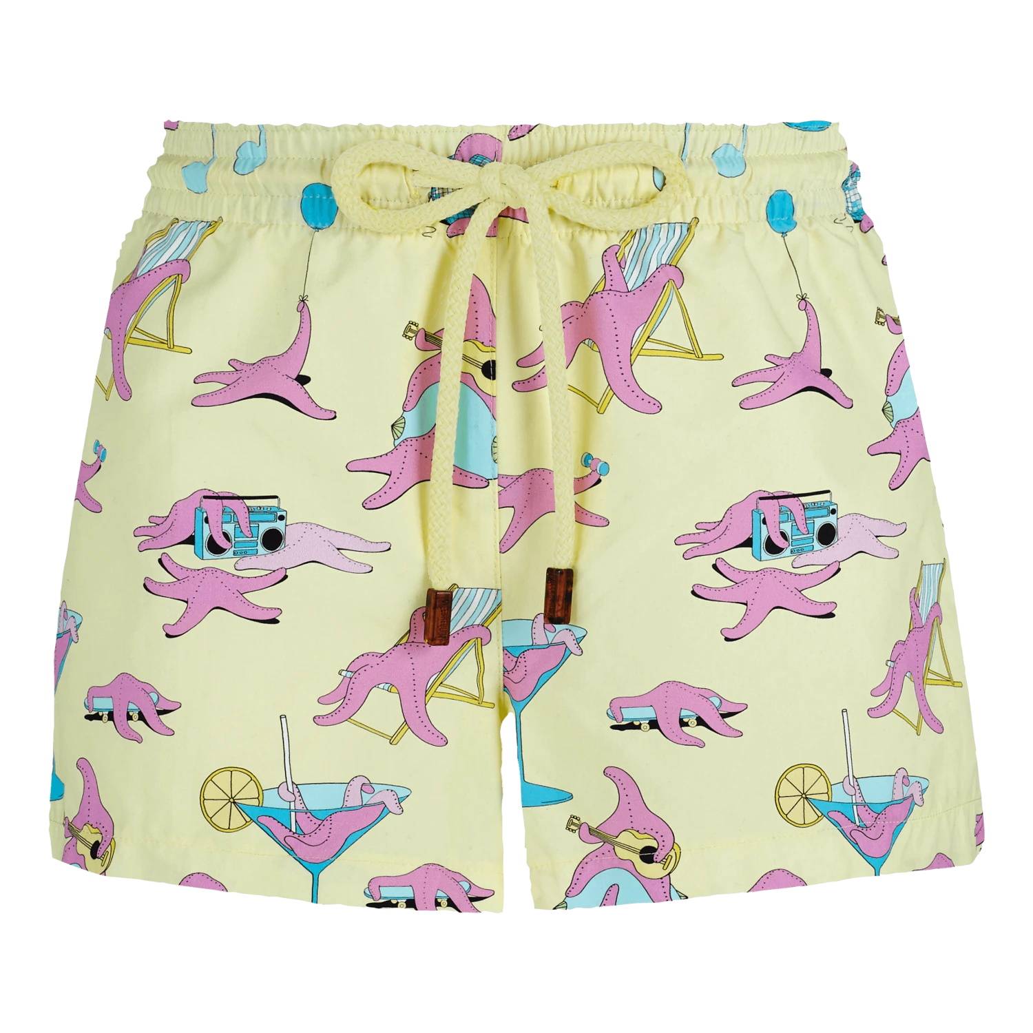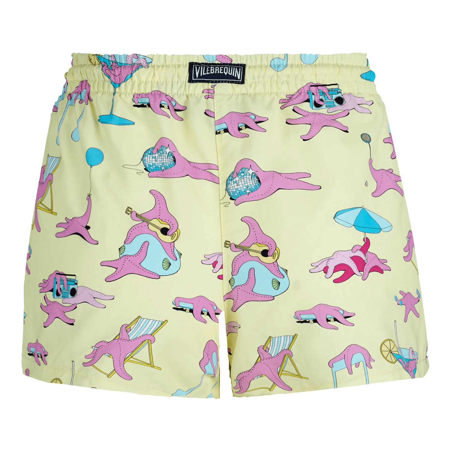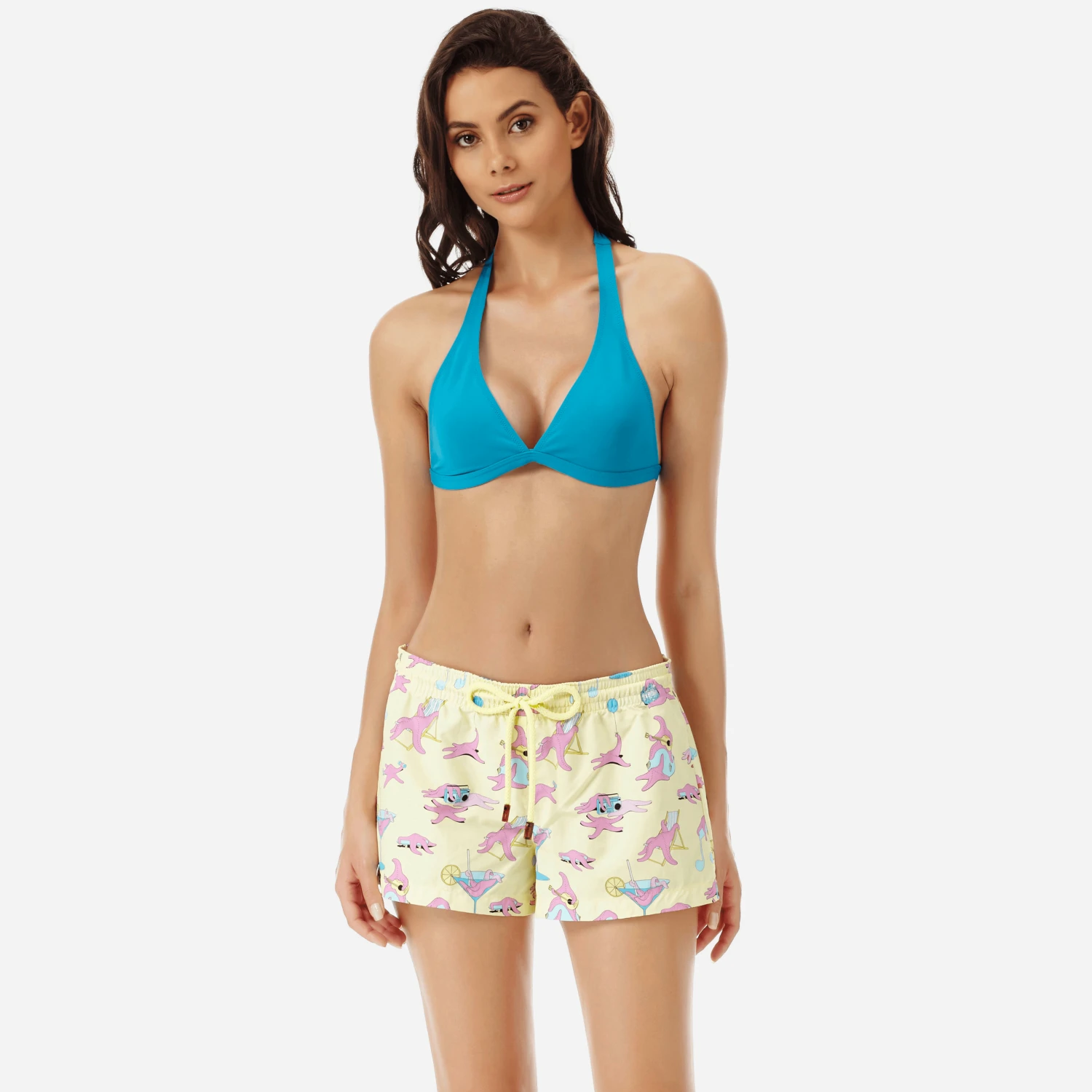 Have fun with the Jeux de Plage print on the Fiona women’s swim shorts. Starfish designed by the illustrator duo Mrzyk and Moriceau are sprinkled all over the straight cut of these swim shorts with side slits. Vilebrequin turtle shell style engraved tips feature on the ends of the drawstring on the elasticated waistband.