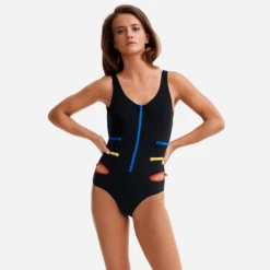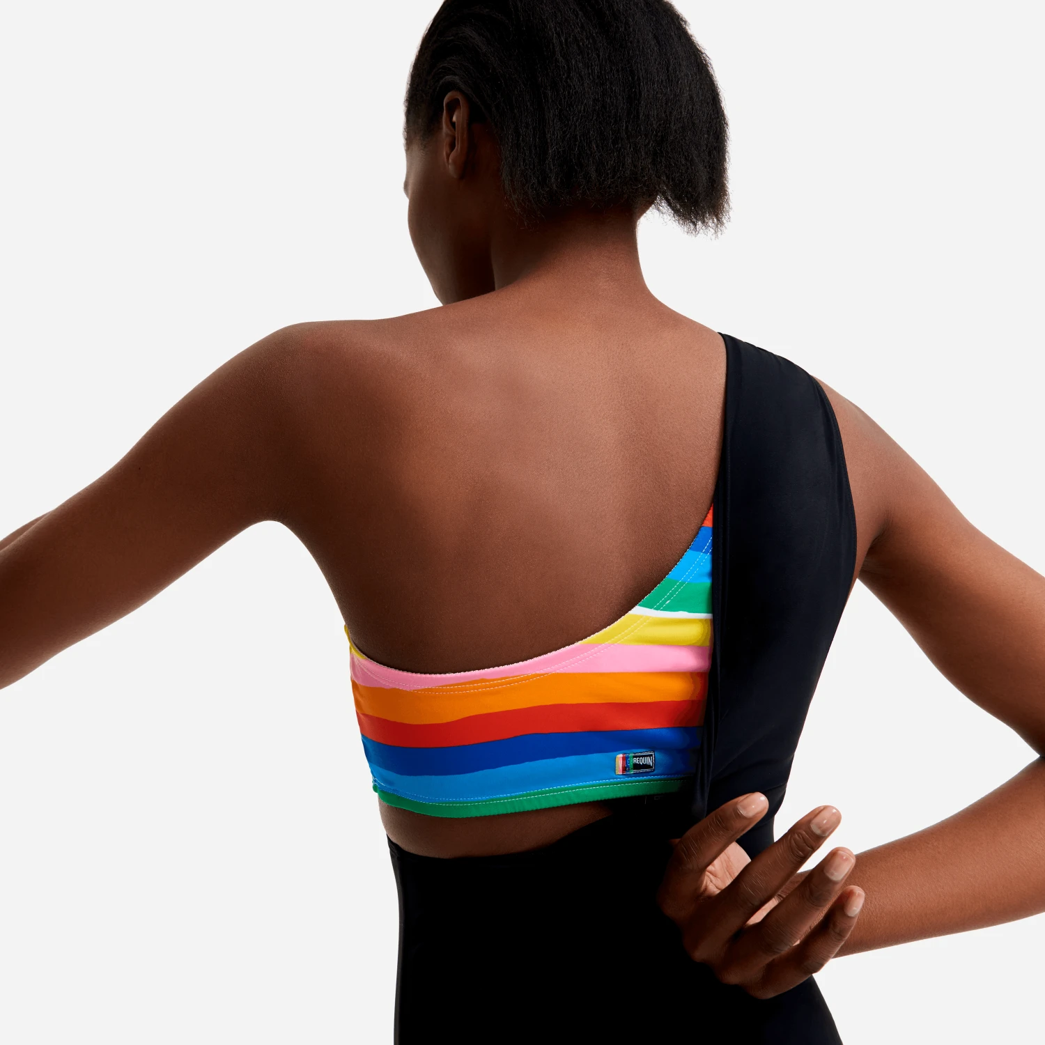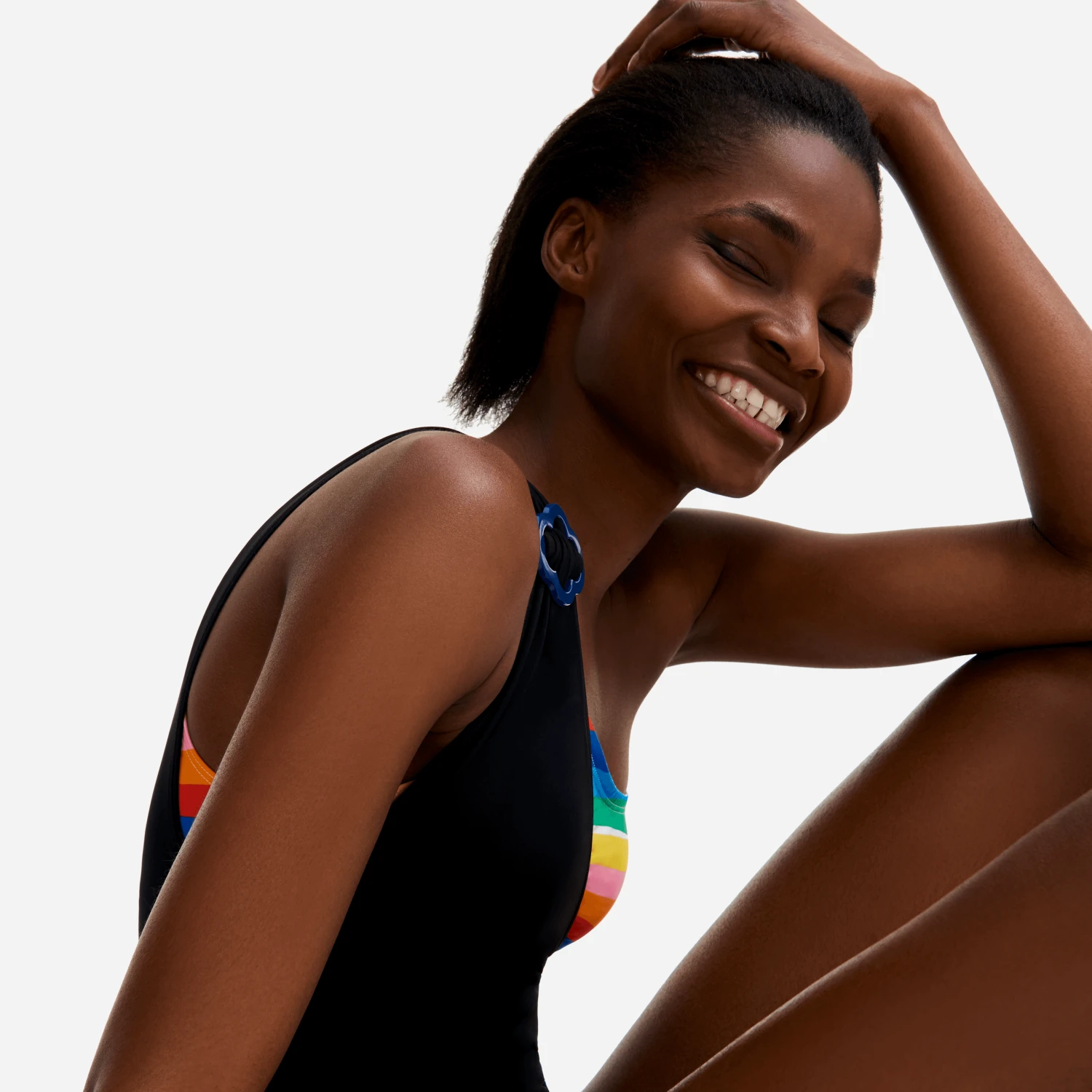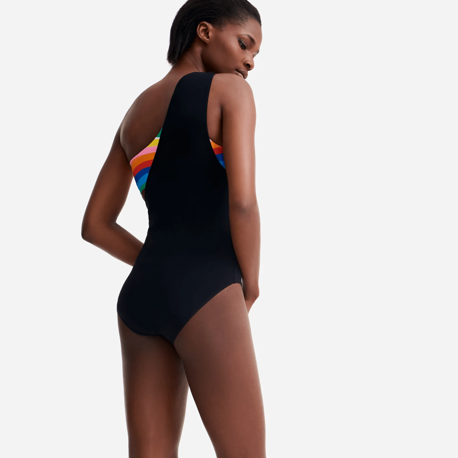 This asymmetrical cut one-piece swimsuit for women, amazon-like, if made of a stretch, soft and comfortable fabric. The rainbow printed bandeau completes elegantly this solid black one-piece swimsuit.