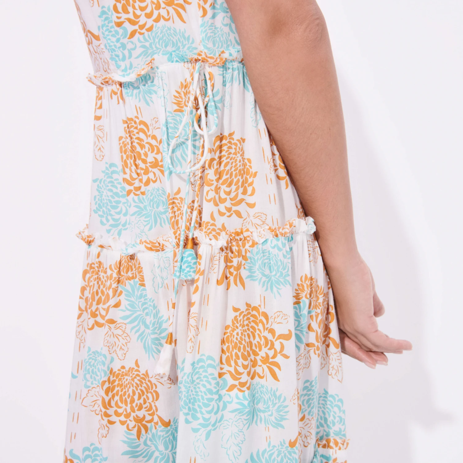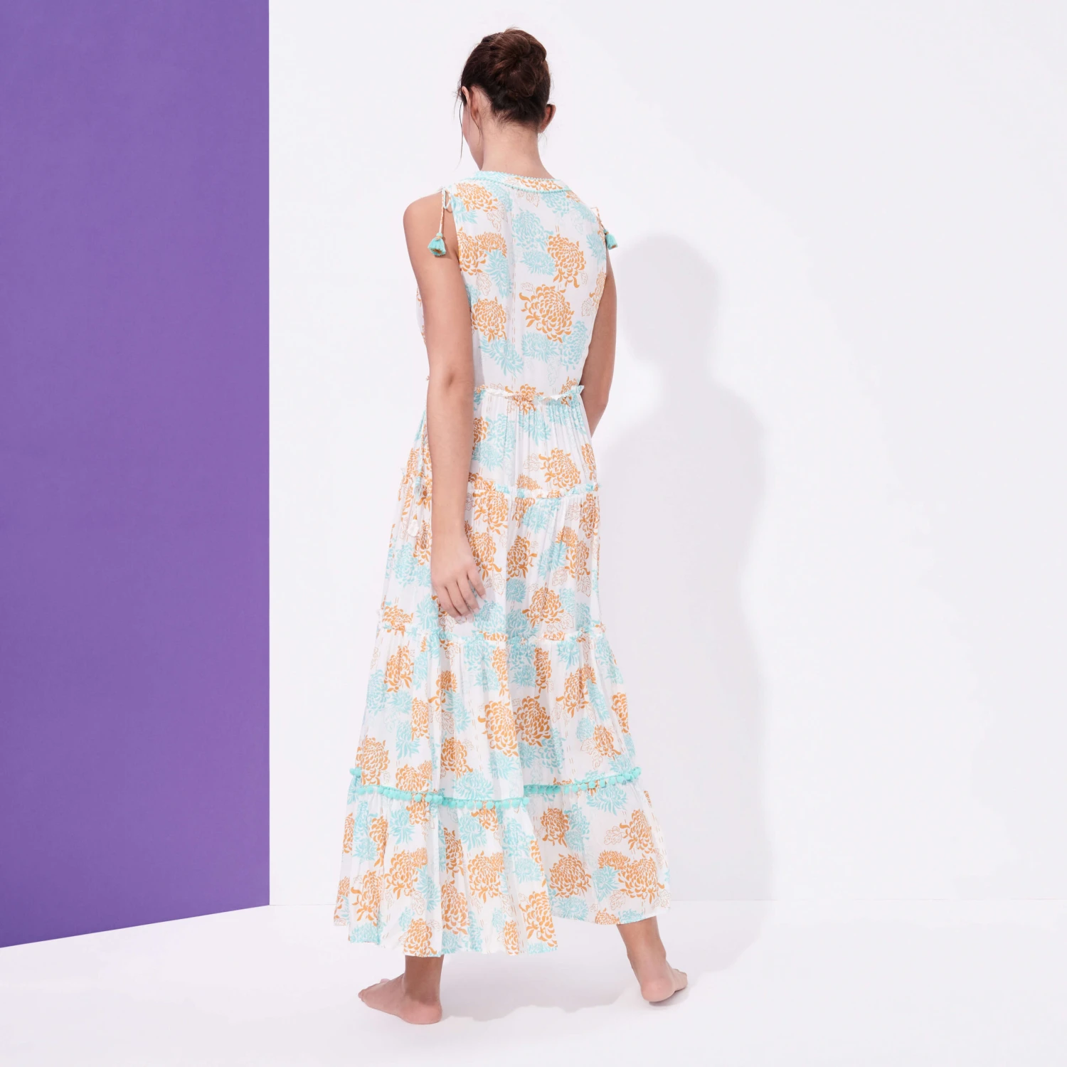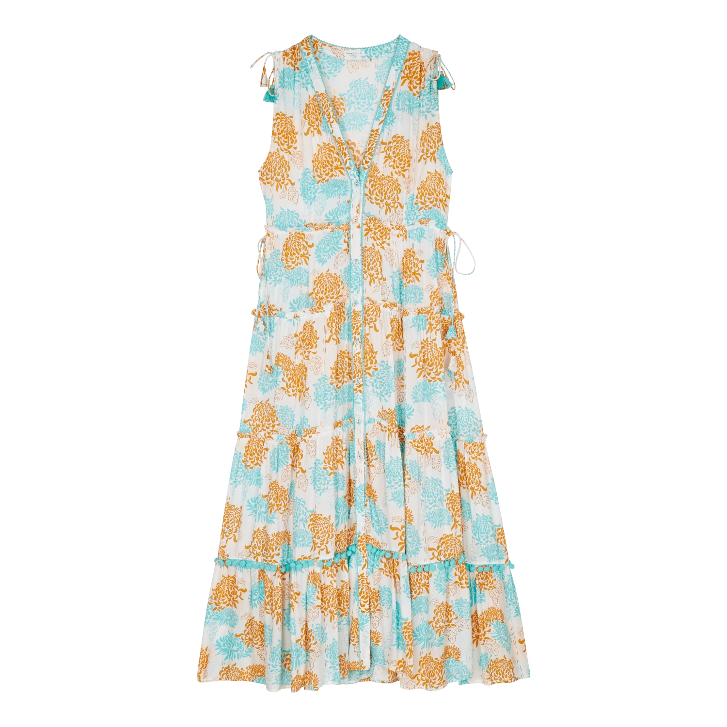 The long tunic-like Ivy dress is embellished with tapered mini ruffles, composed of 5 parts with wide strap sleeves, which can be tapered with strings. It is a model that is buttoned from top to bottom so it can be worn open or closed, with a belt to recenter the waist. Embellished with Poupette St Barth picotte, this dress has white pompoms to play with the color contrast.It can be worn open for a beach outing and can also be worn in the evening, accessorized with a belt and heels.