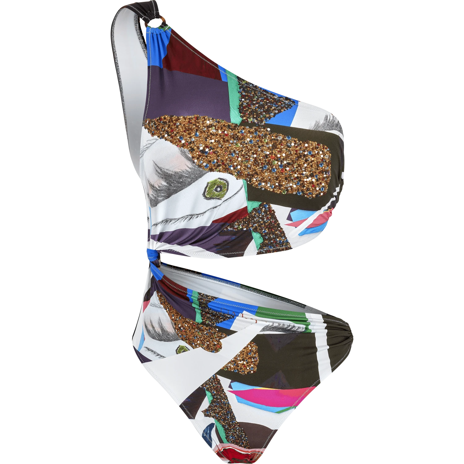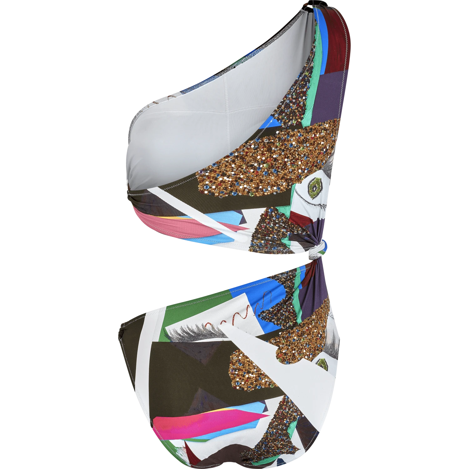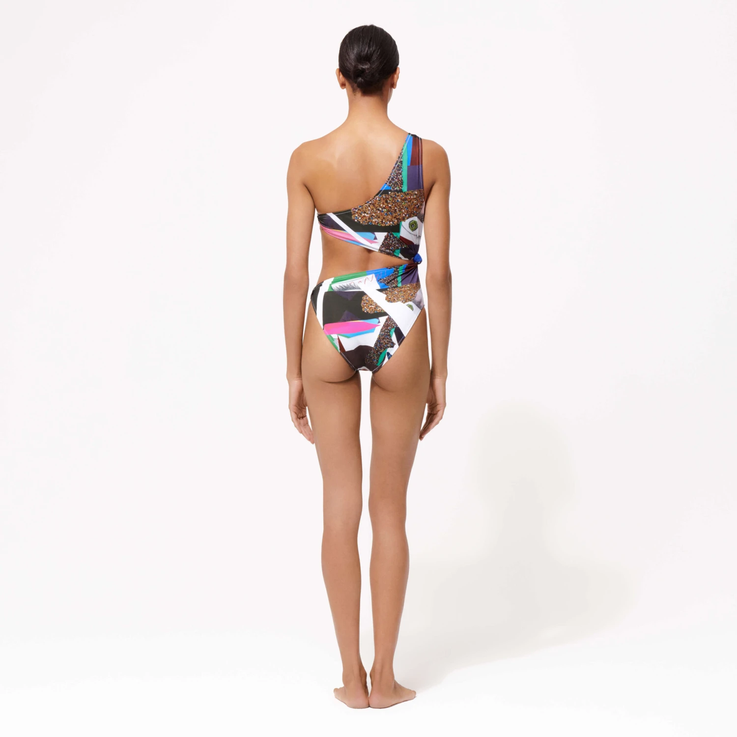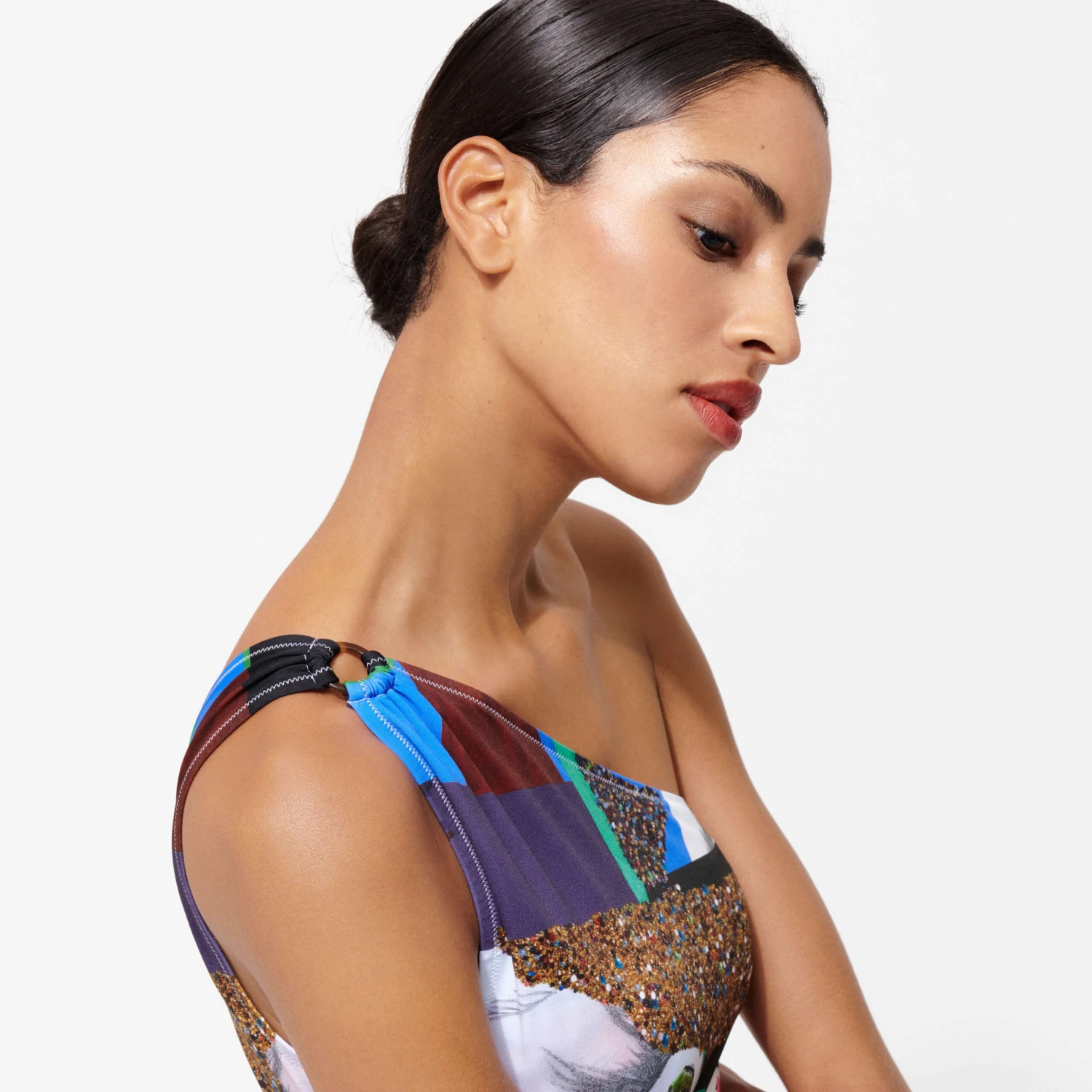 - Metal rings connect the bottom and top of the swimming costume on the left side providing small gathers at the waist